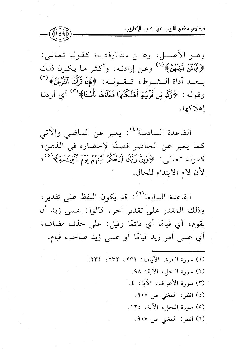وهو الأصل، وعن مشارفته، كقوله تعالى: {فَبَلَغْنَ أَجَلَهُنَّ} 1 وعن إرادته وأكثر ما يكون ذلك بعد أداة الشرط، كقوله: {فَإِذَا قَرَأْتَ الْقُرْآنَ} 2 وقوله: {وَكَمْ مِنْ قَرْيَةٍ أَهْلَكْنَاهَا فَجَاءَهَا بَأْسُنَا} 3 أي أردنا إهلاكها.