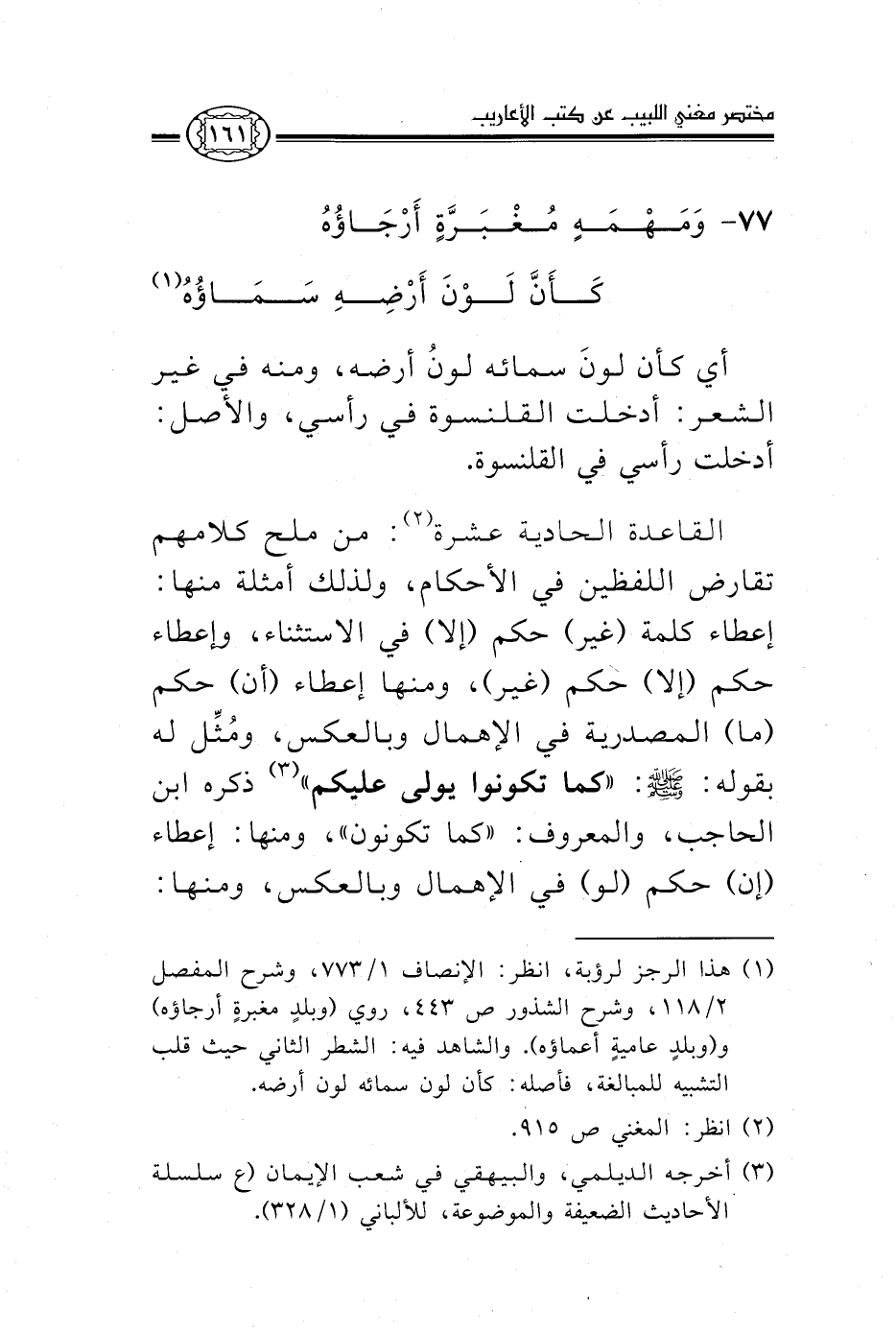 من ملح كلامهم تقارض اللفظين في الأحكام، ولذلك أمثلة منها: إعطاء كلمة غير حكم إلا في الاستثناء، وإعطاء حكم إلا حكم غير، ومنها إعطاء أن حكم ما المصدرية في الإهمال وبالعكس، ومثل له بقوله: "كما تكونوا يولى عليكم" 2 ذكره ابن الحاجب، والمعروف: "كما تكونون"، ومنها: إعطاء إن حكم لو في الإهمال وبالعكس، ومنها: