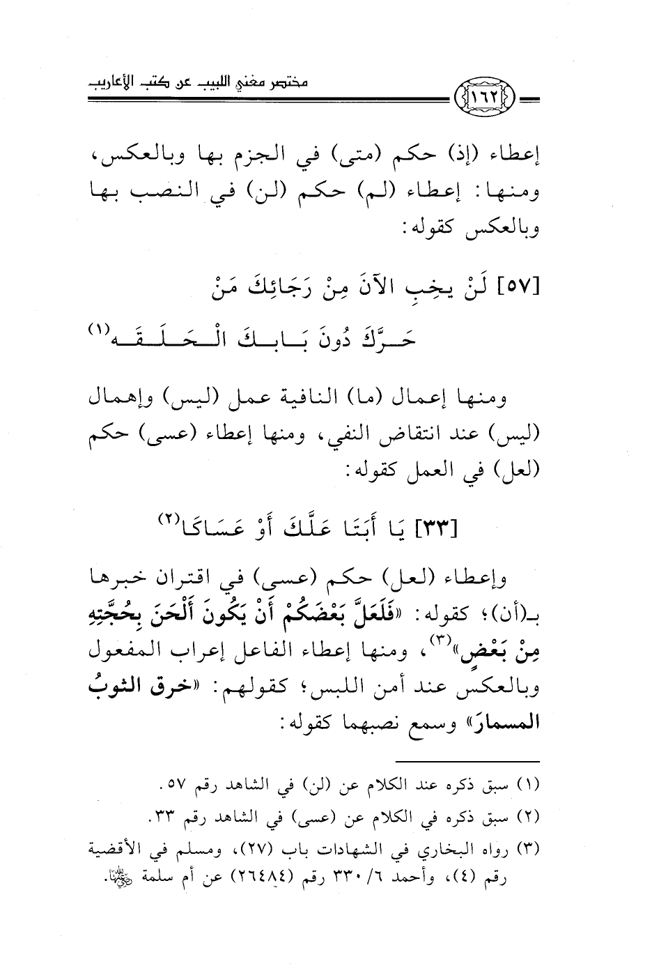 ومنها إعمال ما النافية عمل ليس وإهمال ليس عند انتقاض النفي، ومنها إعطاء عسى حكم لعل في العمل كقوله:
