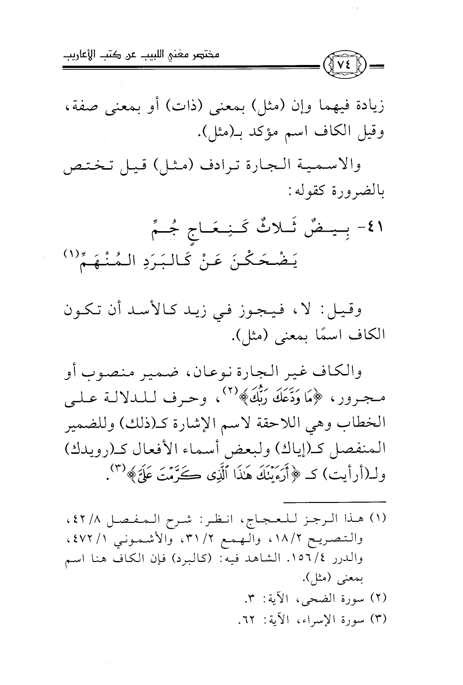 1 هذا الرجز، للعجاج، انظر: شرح المفصل 8/42 والتصريح 2/18 والهمع 2/31 والأشموني 1/472 والدرر 4/156. الشاهد فيه: كالبرد فإن الكاف هنا اسم بمعنى مثل.