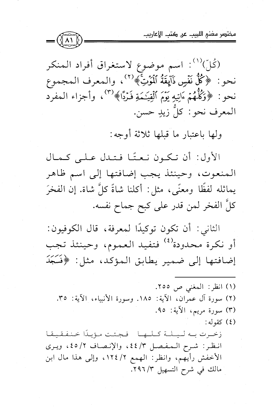 "كل" 1: اسم موضوع لاستغراق أفراد المنكر نحو: {كُلُّ نَفْسٍ ذَائِقَةُ الْمَوْتِ} 2، والمعرف المجموع نحو: {وَكُلُّهُمْ آتِيهِ يَوْمَ الْقِيَامَةِ فَرْداً} 3، وأجزاء المفرد المعرف؛ كل زيد حسن.