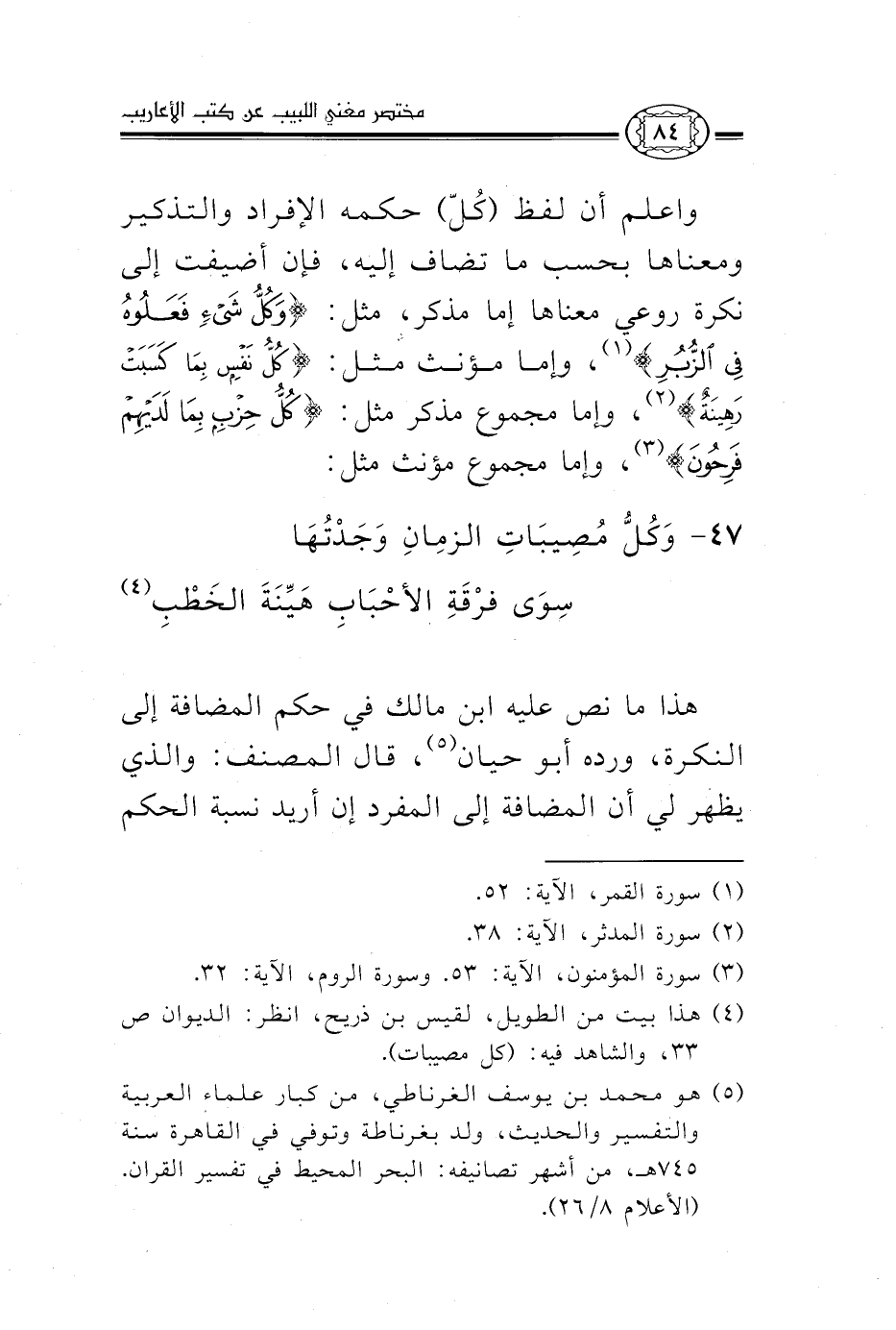 واعلم أن لفظ كل حكمه الإفراد والتذكير ومعناها بحسب ما تضاف إليه، فإن أضيفت إلى نكرة روعي معناها إما مذكر، مثل: {وَكُلُّ شَيْءٍ فَعَلُوهُ فِي الزُّبُرِ} 1، وإما مؤنث مثل: {كُلُّ نَفْسٍ بِمَا كَسَبَتْ رَهِينَةٌ} 2، وإما مجموع مذكر مثل: {كُلُّ حِزْبٍ بِمَا لَدَيْهِمْ فَرِحُونَ} 3، وإما مجموع مؤنث مثل: