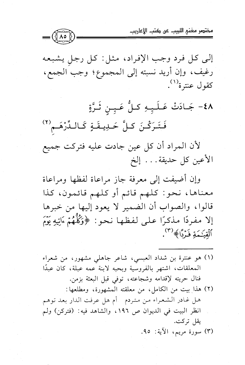 إلى كل فرد وجب الإفراد، مثل: كل رجل يشبعه رغيف، وإن أريد نسبتة إلى المجموع وجب الجمع، كقول عنترة1.