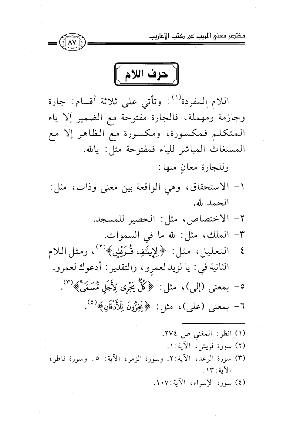اللام المفردة 1: ثلاثة أقسام؛ جارة وجازمة ومهملة، فالجارة مفتوحة مع الضمير إلا ياء المتكلم فمكسورة، ومكسورة مع الظاهر إلا مع المستغاث المباشر للياء فمفتوحة مثل: يا لله.