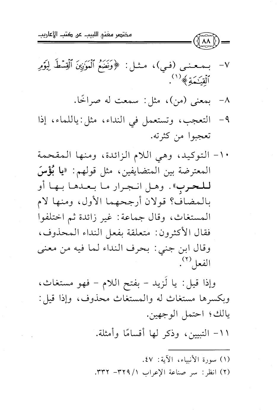 10- التوكيد، وهي اللام الزائدة، ومنها المقحمة المعترضة بين المتضايفين، مثل قولهم: "يا بؤس للحرب". وهل انجرار ما بعدها بها أو بالمضاف؟ قولان أرجحهما الأول، ومنها لام المستغاث، وقال جماعة غير زائدة ثم اختلفوا فقال الأكثرون متعلقة بفعل النداء المحذوف، وقال ابن جني بحرف النداء لما فيه من معنى الفعل2.