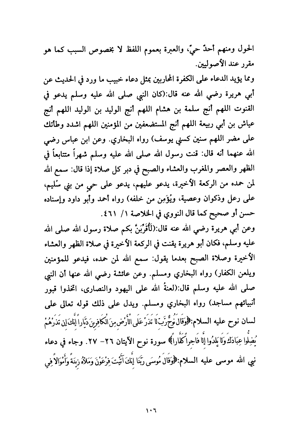 وعن أبي هريرة رضي الله عنه قال: (لَأُقَرِّبَنَّ بكم صلاة رسول الله صلى الله عليه وسلم، فكان أبو هريرة يقنت في الركعة الأخيرة في صلاة الظهر والعشاء الأخيرة وصلاة الصبح بعدما يقول: سمع الله لمن حمده، فيدعو للمؤمنين ويلعن الكفار) رواه البخاري ومسلم. وعن عائشة رضي الله عنها أن النبي صلى الله عليه وسلم قال: (لعنةُ الله على اليهود والنصارى، اتخذوا قبور أنبيائهم مساجد) رواه البخاري ومسلم. ويدل على ذلك قوله تعالى على لسان نوح عليه السلام: {وَقَالَ نُوحٌ رَّبِّ لَا تَذَرْ عَلَى الْأَرْضِ مِنَ الْكَافِرِينَ دَيَّاراً إِنَّكَ إِن تَذَرْهُمْ يُضِلُّوا عِبَادَكَ وَلَا يَلِدُوا إِلَّا فَاجِراً كَفَّاراً} سورة نوح الآيتان 26 - 27. وجاء في دعاء نبي الله موسى عليه السلام: {وَقَالَ مُوسَى رَبَّنَا إِنَّكَ آتَيْتَ فِرْعَوْنَ وَمَلأهُ زِينَةً وَأَمْوَالاً فِي