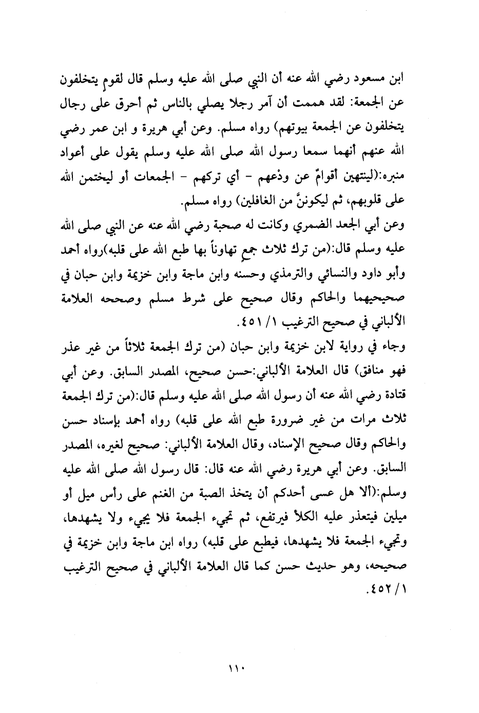 ابن مسعود رضي الله عنه أن النبي صلى الله عليه وسلم قال لقومٍ يتخلفون عن الجمعة: لقد هممت أن آمر رجلا يصلي بالناس ثم أحرق على رجال يتخلفون عن الجمعة بيوتهم) رواه مسلم. وعن أبي هريرة وابن عمر رضي الله عنهم أنهما سمعا رسول الله صلى الله عليه وسلم يقول على أعواد منبره: (لينتهين أقوامٌ عن ودْعهم - أي تركهم - الجمعات أو ليختمن الله على قلوبهم، ثم ليكوننَّ من الغافلين) رواه مسلم.