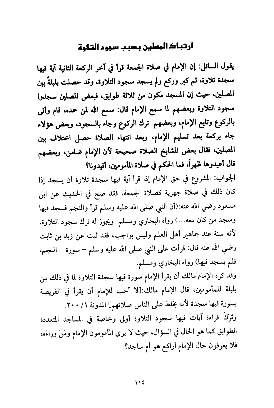 وقد كره الإمام مالك أن يقرأ الإمام سورة فيها سجدة التلاوة لما في ذلك من بلبلة للمأمومين، قال الإمام مالك: [لا أحب للإمام أن يقرأ في الفريضة بسورة فيها سجدة لأنه يخلط على الناس صلاتهم] المدونة 1/ 200.
