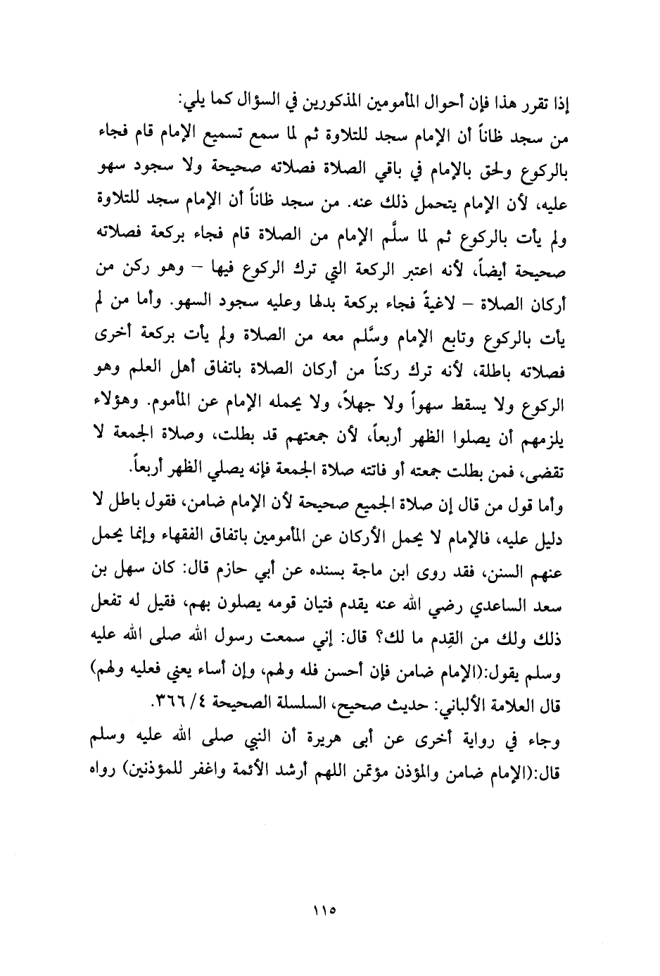 وأما قول من قال إن صلاة الجميع صحيحة لأن الإمام ضامن، فقول باطل لا دليل عليه، فالإمام لا يحمل الأركان عن المأمومين باتفاق الفقهاء وإنما يحمل عنهم السنن، فقد روى ابن ماجة بسنده عن أبي حازم قال: كان سهل بن سعد الساعدي رضي الله عنه يقدم فتيان قومه يصلون بهم، فقيل له تفعل ذلك ولك من القِدم ما لك؟ قال: إني سمعت رسول الله صلى الله عليه وسلم يقول: (الإمام ضامن فإن أحسن فله ولهم، وإن أساء يعني فعليه ولهم) قال العلامة الألباني: حديث صحيح، السلسلة الصحيحة 4/ 366.