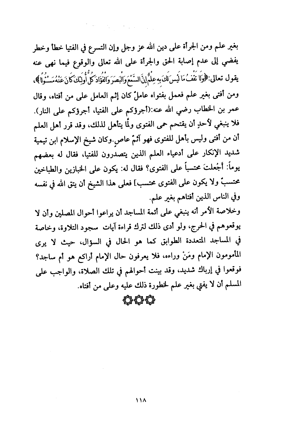 بغير علم ومن الجرأة على دين الله عز وجل وإن التسرع في الفتيا خطأ وخطر يفضي إلى عدم إصابة الحق والجرأة على الله تعالى والوقوع
