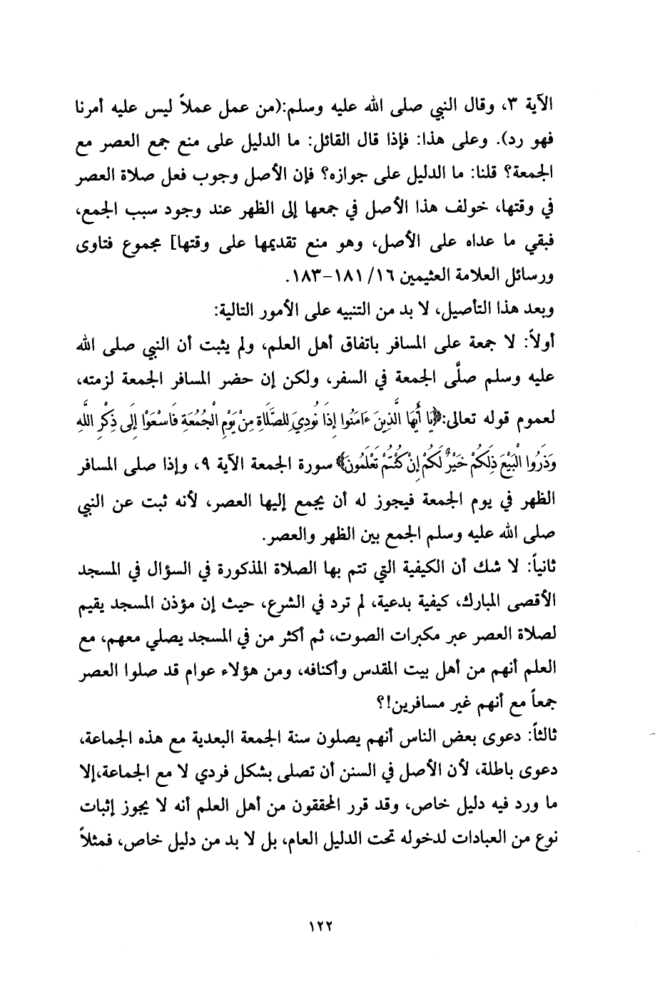 الآية 3، وقال النبي صلى الله عليه وسلم: (من عمل عملاً ليس عليه أمرنا فهو رد). وعلى هذا: فإذا قال القائل: ما الدليل على منع جمع العصر مع الجمعة؟ قلنا: ما الدليل على جوازه؟ فإن الأصل وجوب فعل صلاة العصر في وقتها، خولف هذا الأصل في جمعها إلى الظهر عند وجود سبب الجمع، فبقي ما عداه على الأصل، وهو منع تقديمها على وقتها] مجموع فتاوى ورسائل العلامة العثيمين 16/ 181 - 183.