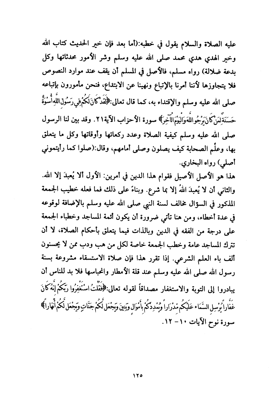 عليه الصلاة والسلام يقول في خطبه: (أما بعد فإن خير الحديث كتاب الله وخير الهدي هدي محمد صلى الله عليه وسلم وشر الأمور محدثاتها وكل بدعة ضلالة) رواه مسلم، فالأصل في المسلم أن يقف عند موارد النصوص فلا يتجاوزها لأننا أمرنا بالإتباع ونهينا عن الابتداع، فنحن مأمورون بإتباعه صلى الله عليه وسلم والإقتداء به، كما