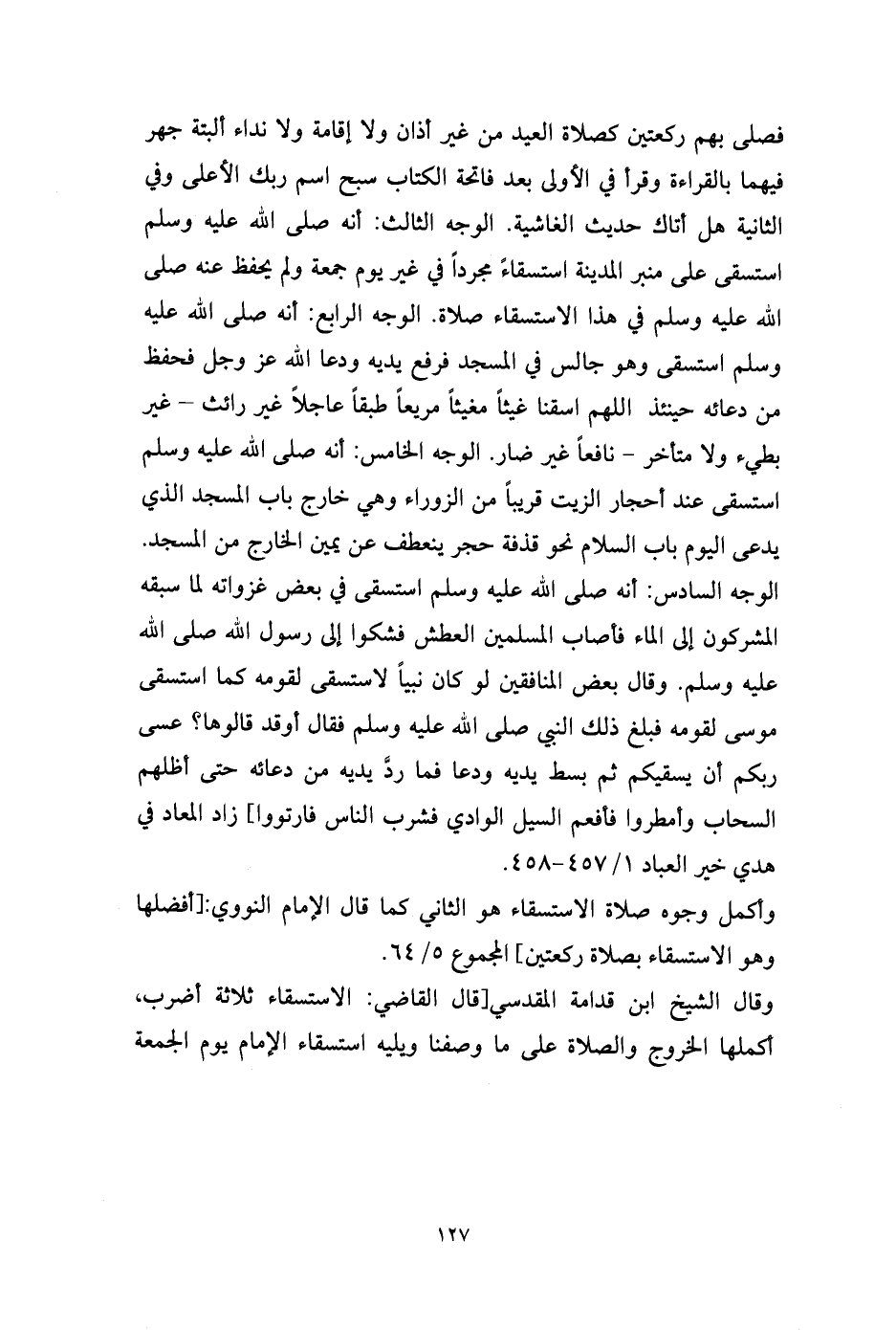 فصلى بهم ركعتين كصلاة العيد من غير أذان ولا إقامة ولا نداء ألبتة جهر فيهما بالقراءة وقرأ في الأولى بعد فاتحة الكتاب سبح اسم ربك الأعلى وفي الثانية هل أتاك حديث الغاشية. الوجه الثالث: أنه صلى الله عليه وسلم استسقى على منبر المدينة استسقاءً مجرداً في غير يوم جمعة ولم يحفظ عنه صلى الله عليه وسلم في هذا الاستسقاء صلاة. الوجه الرابع: أنه صلى الله عليه وسلم استسقى وهو جالس في المسجد فرفع يديه ودعا الله عز وجل فحفظ من دعائه حينئذ اللهم اسقنا غيثاً مغيثاً مريعاً طبقاً عاجلاً غير رائث - غير بطيء ولا متأخر - نافعاً غير ضار. الوجه الخامس: أنه صلى الله عليه وسلم استسقى عند أحجار الزيت قريباً من الزوراء وهي خارج باب المسجد الذي يدعى اليوم باب السلام نحو قذفة حجر ينعطف عن يمين الخارج من المسجد. الوجه السادس: أنه صلى الله عليه وسلم استسقى في بعض غزواته لما سبقه المشركون إلى الماء فأصاب المسلمين العطش فشكوا إلى رسول الله صلى الله عليه وسلم. وقال بعض المنافقين لو كان نبياً لاستسقى لقومه كما استسقى موسى لقومه فبلغ ذلك النبي صلى الله عليه وسلم فقال أوقد قالوها؟ عسى ربكم أن يسقيكم ثم بسط يديه ودعا فما ردَّ يديه من دعائه حتى أظلهم السحاب وأمطروا فأفعم السيل الوادي فشرب الناس فارتووا] زاد المعاد في هدي خير العباد 1/ 457 - 458.