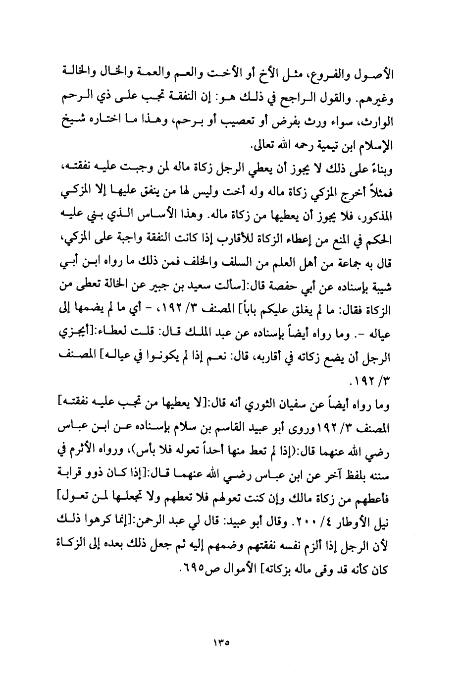 وما رواه أيضاً عن سفيان الثوري أنه قال: [لا يعطيها من تجب عليه نفقته] المصنف 3/ 192وروى أبو عبيد القاسم بن سلام بإسناده عن ابن عباس رضي الله عنهما قال: (إذا لم تعط منها أحداً تعوله فلا بأس)، ورواه الأثرم في سننه بلفظ آخر عن ابن عباس رضي الله عنهما قال: [إذا كان ذوو قرابة فأعطهم من زكاة مالك وإن كنت تعولهم فلا تعطهم ولا تجعلها لمن تعول] نيل الأوطار 4/ 200. وقال أبو عبيد: قال لي عبد الرحمن: [إنما كرهوا ذلك لأن الرجل إذا ألزم نفسه نفقتهم وضمهم إليه ثم جعل ذلك بعده إلى الزكاة كان كأنه قد وقى ماله بزكاته] الأموال ص695.