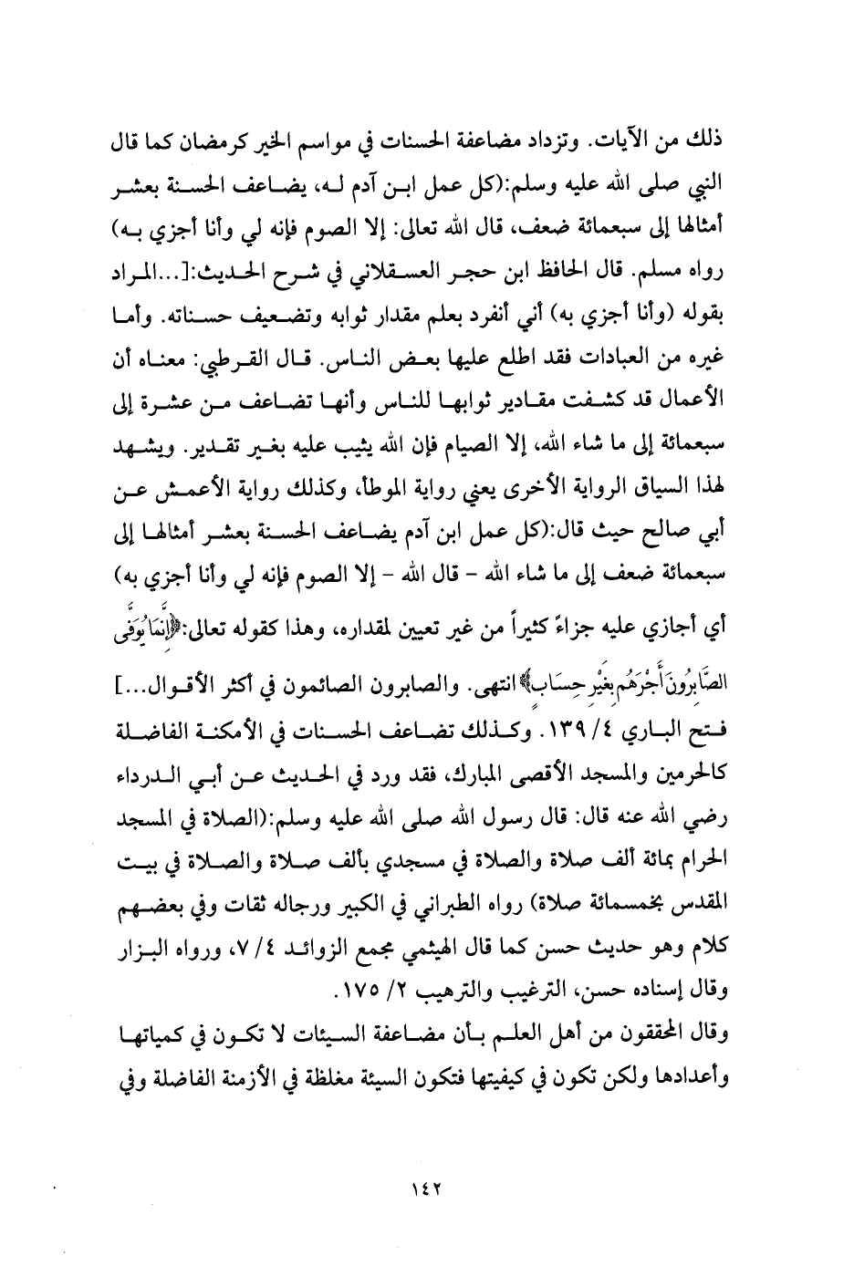 أَجْرَهُم بِغَيْرِ حِسَابٍ} انتهى. والصابرون الصائمون في أكثر الأقوال ... ] فتح الباري 4/ 139. وكذلك تضاعف الحسنات في الأمكنة الفاضلة كالحرمين والمسجد الأقصى المبارك، فقد ورد في الحديث عن أبي الدرداء رضي الله عنه قال: قال رسول الله صلى الله عليه وسلم: (الصلاة في المسجد الحرام بمائة ألف صلاة والصلاة في مسجدي بألف صلاة والصلاة في بيت المقدس بخمسمائة صلاة) رواه الطبراني في الكبير ورجاله ثقات وفي بعضهم كلام وهو حديث حسن كما قال الهيثمي مجمع الزوائد 4/ 7، ورواه البزار وقال إسناده حسن، الترغيب والترهيب 2/ 175.