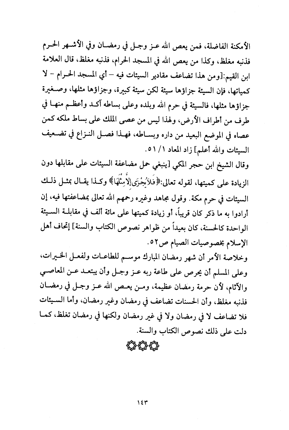 وقال الشيخ ابن حجر المكي [ينبغي حمل مضاعفة السيئات على مقابلها دون الزيادة على كميتها، لقوله تعالى: {فَلاَ يُجْزَى إِلاَّ مِثْلَهَا} وكذا يقال بمثل ذلك السيئات في حرم مكة. وقول مجاهد وغيره رحمهم الله تعالى بمضاعفتها فيه، إن أرادوا به ما ذكر كان قريباً، أو زيادة كميتها على مائة ألف في مقابلة السيئة الواحدة كالحسنة، كان بعيداً من ظواهر نصوص الكتاب والسنة] إتحاف أهل الإسلام بخصوصيات الصيام ص52.