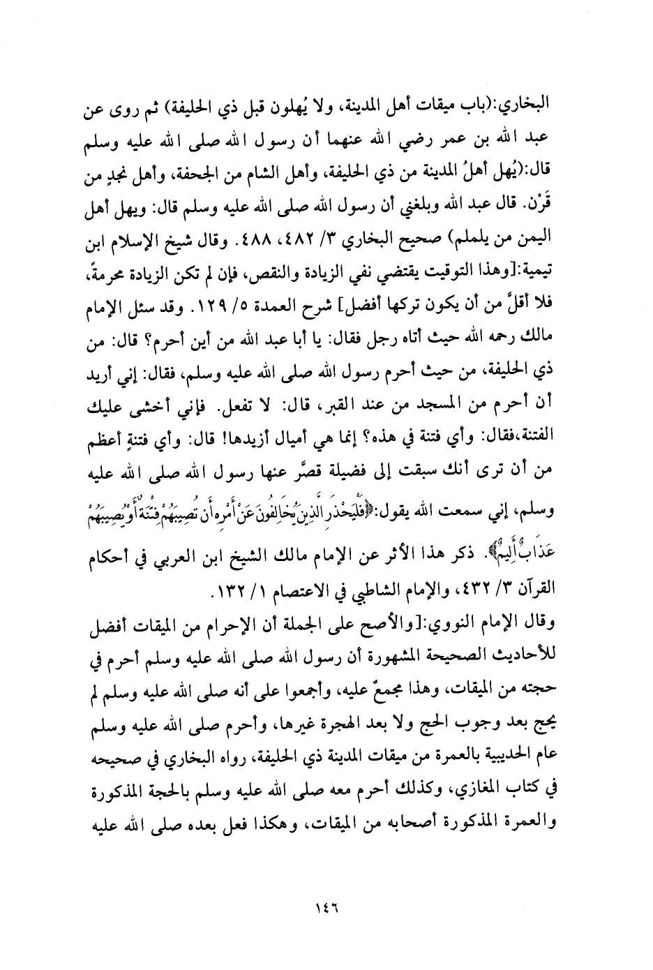 البخاري: (باب ميقات أهل المدينة، ولا يُهلون قبل ذي الحليفة) ثم روى عن عبد الله بن عمر رضي الله عنهما أن رسول الله صلى الله عليه وسلم قال: (يُهل أهلُ المدينة من ذي الحليفة، وأهل الشام من الجحفة، وأهل نجدٍ من قَرْن. قال عبد الله وبلغني أن رسول الله صلى الله عليه وسلم قال: ويهل أهل اليمن من يلملم) صحيح البخاري 3/ 482، 488. وقال شيخ الإسلام ابن تيمية: [وهذا التوقيت يقتضي نفي الزيادة والنقص، فإن لم تكن الزيادة محرمةً، فلا أقلَّ من أن يكون تركها أفضل] شرح العمدة 5/ 129. وقد سئل الإمام مالك رحمه الله حيث أتاه رجل فقال: يا أبا عبد الله من أين أحرم؟ قال: من ذي الحليفة، من حيث أحرم رسول الله صلى الله عليه وسلم، فقال: إني أريد أن أحرم من المسجد من عند القبر، قال: لا تفعل. فإني أخشى عليك الفتنة، فقال: وأي فتنة في هذه؟ إنما هي أميال أزيدها! قال: وأي فتنةٍ أعظم من أن ترى أنك سبقت إلى فضيلة قصَّر عنها رسول الله صلى الله عليه وسلم، إني سمعت الله يقول: {فَلْيَحْذَرِ الَّذِينَ يُخَالِفُونَ عَنْ أَمْرِهِ أَن تُصِيبَهُمْ فِتْنَةٌ أَوْ يُصِيبَهُمْ عَذَابٌ أَلِيمٌ}. ذكر هذا الأثر عن الإمام مالك الشيخ ابن العربي في أحكام القرآن 3/ 432، والإمام الشاطبي في الاعتصام 1/ 132.