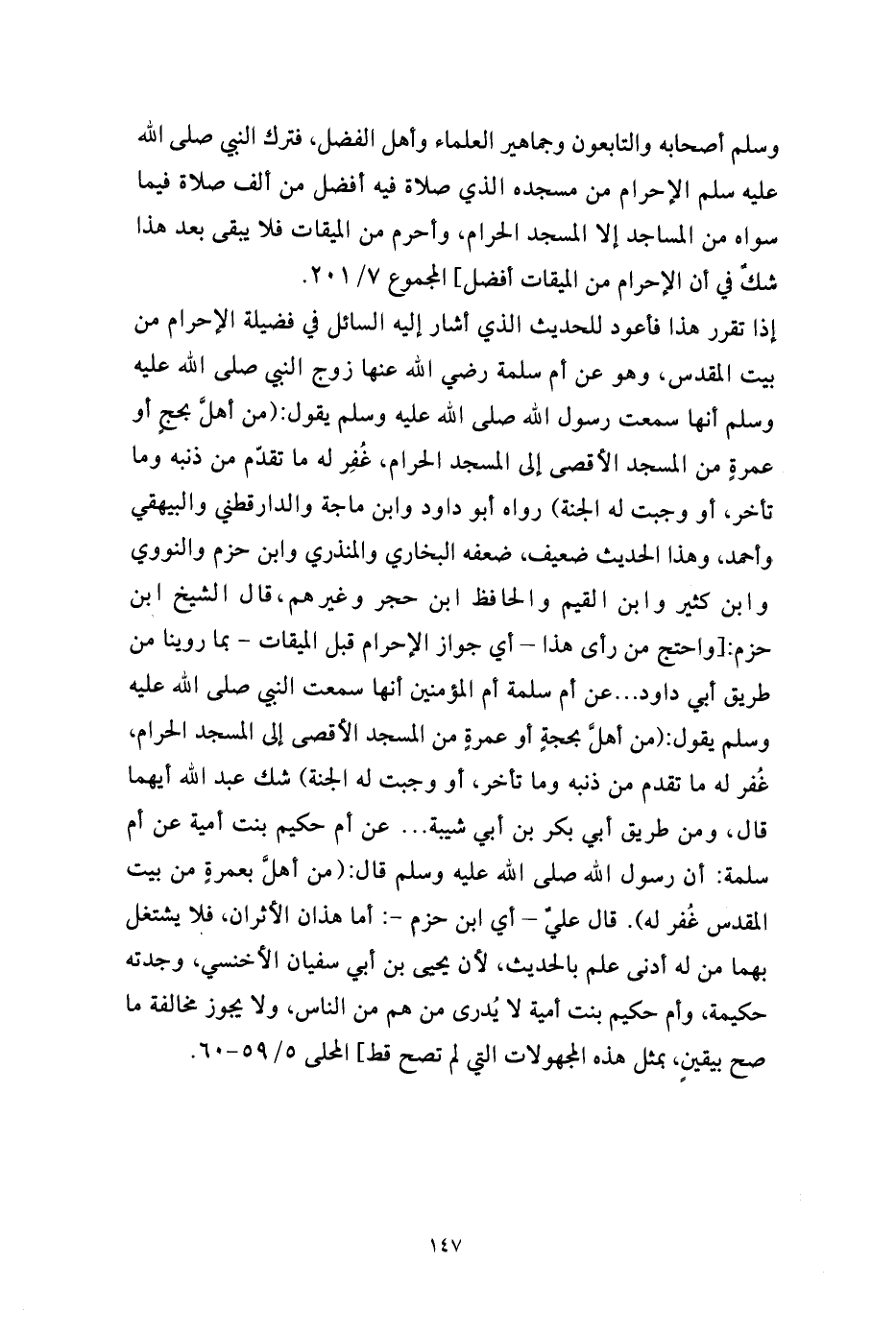إذا تقرر هذا فأعود للحديث الذي أشار إليه السائل في فضيلة الإحرام من بيت المقدس، وهو عن أم سلمة رضي الله عنها زوج النبي صلى الله عليه وسلم أنها سمعت رسول الله صلى الله عليه وسلم يقول: (من أهلَّ بحجٍ أو عمرةٍ من المسجد الأقصى إلى المسجد الحرام، غُفِر له ما تقدّم من ذنبه وما تأخر، أو وجبت له الجنة) رواه أبو داود وابن ماجة والدارقطني والبيهقي وأحمد، وهذا الحديث ضعيف، ضعفه البخاري والمنذري وابن حزم والنووي وابن كثير وابن القيم والحافظ ابن حجر وغيرهم، قال الشيخ ابن حزم: [واحتج من رأى هذا - أي جواز الإحرام قبل الميقات - بما روينا من طريق أبي داود ... عن أم سلمة أم المؤمنين أنها سمعت النبي صلى الله عليه وسلم يقول: (من أهلَّ بحجةٍ أو عمرةٍ من المسجد الأقصى إلى المسجد الحرام، غُفر له ما تقدم من ذنبه وما تأخر، أو وجبت له الجنة) شك عبد الله أيهما قال، ومن طريق أبي بكر بن أبي شيبة ... عن أم حكيم بنت أمية عن أم سلمة: أن رسول الله صلى الله عليه وسلم قال: (من أهلَّ بعمرةٍ من بيت المقدس غُفر له). قال عليٌ - أي ابن حزم -: أما هذان الأثران، فلا يشتغل بهما من له أدنى علم بالحديث، لأن يحيى بن أبي سفيان الأخنسي، وجدته حكيمة، وأم حكيم بنت أمية لا يُدرى من هم من الناس، ولا يجوز مخالفة ما صح بيقينٍ، بمثل هذه المجهولات التي لم تصح قط] المحلى 5/ 59 - 60.