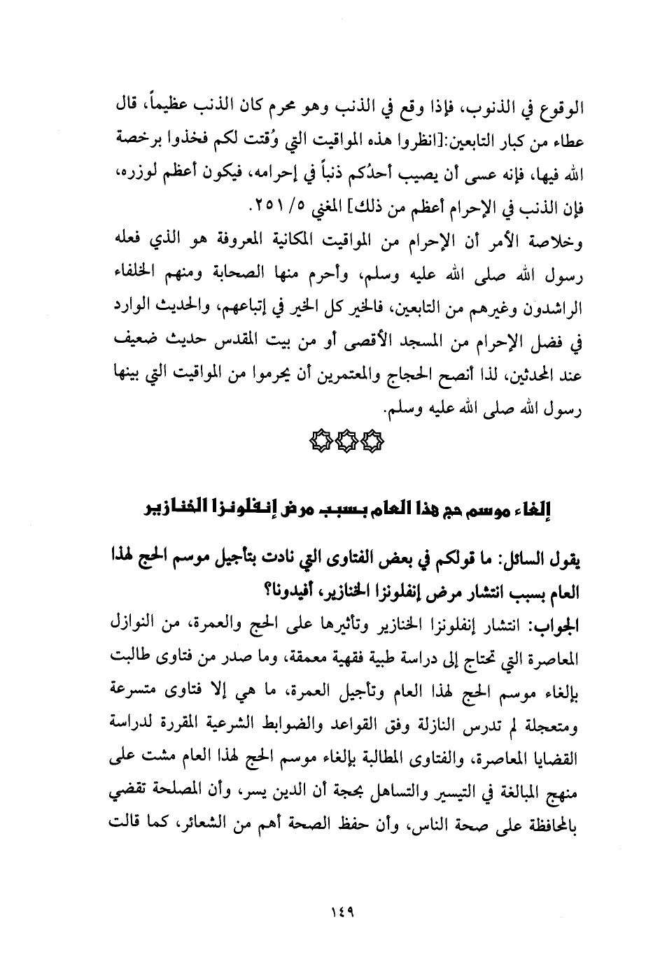 الجواب: انتشار إنفلونزا الخنازير وتأثيرها على الحج والعمرة، من النوازل المعاصرة التي تحتاج إلى دراسة طبية فقهية معمقة، وما صدر من فتاوى طالبت بإلغاء موسم الحج لهذا العام وتأجيل العمرة، ما هي إلا فتاوى متسرعة ومتعجلة لم تدرس النازلة وفق القواعد والضوابط الشرعية المقررة لدراسة القضايا المعاصرة، والفتاوى المطالبة بإلغاء موسم الحج لهذا العام مشت على منهج المبالغة في التيسير والتساهل بحجة أن الدين يسر، وأن المصلحة تقضي بالمحافظة على صحة الناس، وأن حفظ الصحة أهم من الشعائر، كما قالت