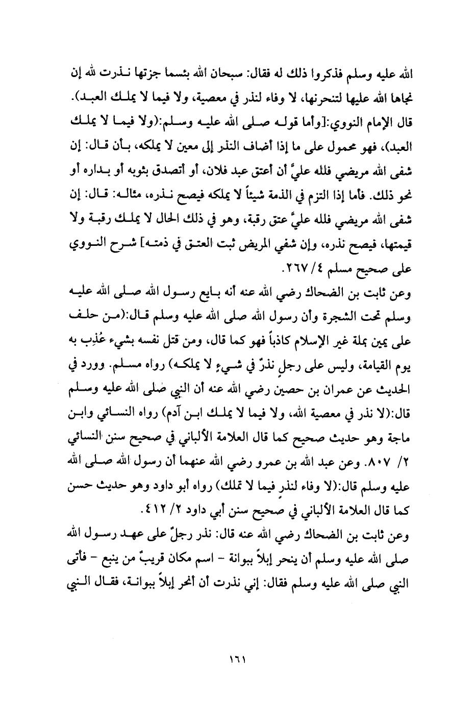 الله عليه وسلم فذكروا ذلك له فقال: سبحان الله بئسما جزتها نذرت لله إن نجاها الله عليها لتنحرنها، لا وفاء لنذر في معصية، ولا فيما لا يملك العبد). قال الإمام النووي: [وأما قوله صلى الله عليه وسلم: (ولا فيما لا يملك العبد)، فهو محمول على ما إذا أضاف النذر إلى معين لا يملكه، بأن قال: إن شفى الله مريضي فلله عليَّ أن أعتق عبد فلان، أو أتصدق بثوبه أو بداره أو نحو ذلك. فأما إذا التزم في الذمة شيئاً لا يملكه فيصح نذره، مثاله: قال: إن شفى الله مريضي فلله عليَّ عتق رقبة، وهو في ذلك الحال لا يملك رقبة ولا