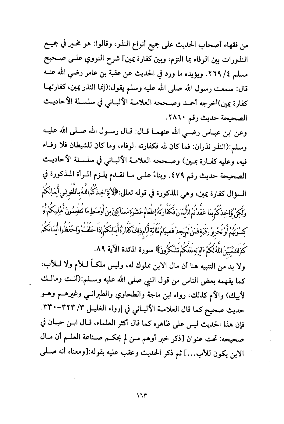 من فقهاء أصحاب الحديث على جميع أنواع النذر، وقالوا: هو مخير في جميع النذورات بين الوفاء بما التزم، وبين كفارة يمين] شرح النووي على صحيح مسلم 4/ 269. ويؤيده ما ورد في الحديث عن عقبة بن عامر رضي الله عنه قال: سمعت رسول الله صلى الله عليه وسلم يقول: (إنما النذر يمين، كفارتها كفارة يمين) أخرجه أحمد وصححه العلامة الألباني في سلسلة الأحاديث الصحيحة حديث رقم 2860.