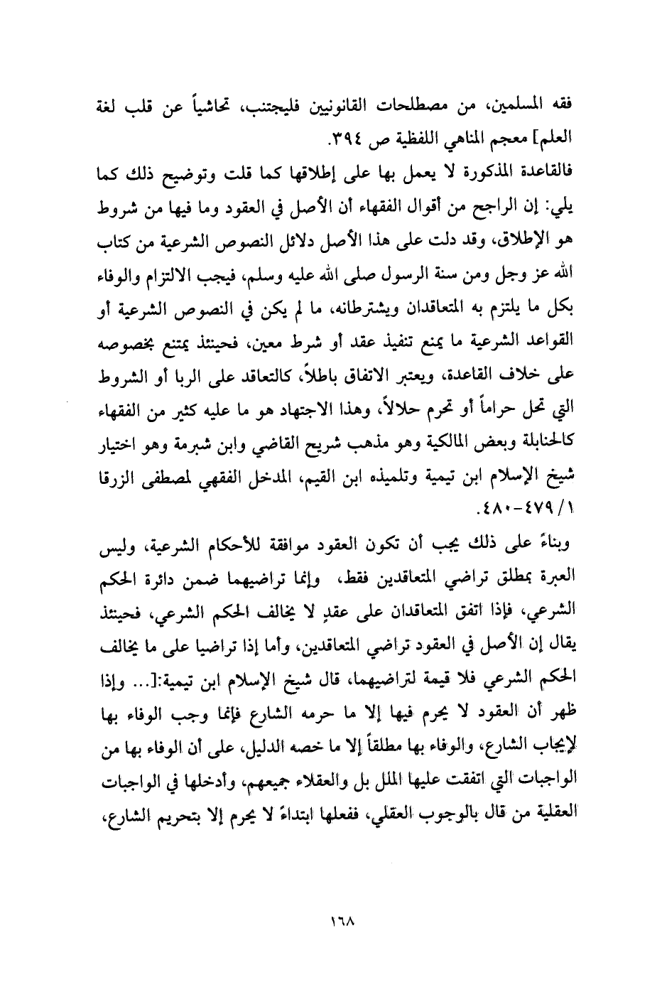 فحينئذ يمتنع بخصوصه على خلاف القاعدة، ويعتبر الاتفاق باطلاً، كالتعاقد على الربا أو الشروط التي تحل حراماً أو تحرم حلالاً، وهذا الاجتهاد هو ما عليه كثير من الفقهاء كالحنابلة وبعض المالكية وهو مذهب شريح القاضي وابن شبرمة وهو اختيار شيخ الإسلام ابن تيمية وتلميذه ابن القيم، المدخل الفقهي لمصطفى الزرقا 1/ 479 - 480.