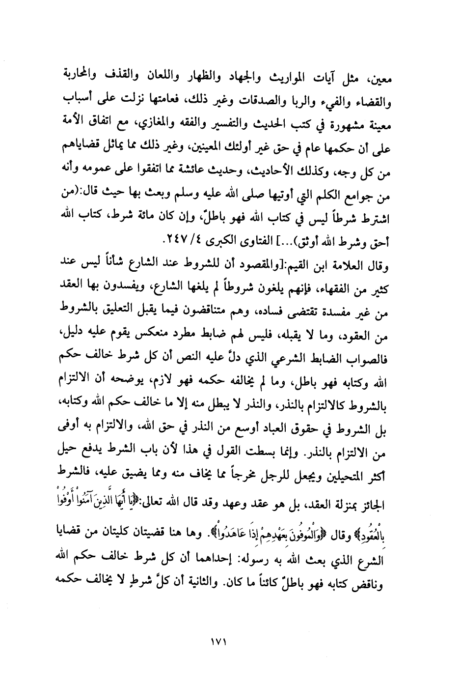 وقال العلامة ابن القيم: [والمقصود أن للشروط عند الشارع شأناً ليس عند كثير من الفقهاء، فإنهم يلغون شروطاً لم يلغها الشارع، ويفسدون بها العقد من غير مفسدة تقتضى فساده، وهم متناقضون فيما يقبل التعليق بالشروط من العقود، وما لا يقبله، فليس لهم ضابط مطرد منعكس يقوم عليه دليل، فالصواب الضابط الشرعي الذي دلَّ عليه النص أن كل شرط خالف حكم الله وكتابه فهو باطل، وما لم يخالفه حكمه فهو لازم، يوضحه أن الالتزام بالشروط كالالتزام بالنذر، والنذر لا يبطل منه إلا ما خالف حكم الله وكتابه، بل الشروط في حقوق العباد أوسع من النذر في حق الله، والالتزام به أوفى من الالتزام بالنذر. وإنما بسطت القول في هذا لأن باب الشرط يدفع حيل أكثر المتحيلين ويجعل للرجل مخرجاً مما يخاف منه ومما يضيق عليه، فالشرط الجائز بمنزلة العقد، بل هو عقد وعهد وقد قال الله تعالى: {يَا أَيُّهَا الَّذِينَ آمَنُواْ أَوْفُواْ بِالْعُقُودِ} وقال {وَالْمُوفُونَ بِعَهْدِهِمْ إِذَا عَاهَدُواْ}. وها هنا قضيتان كليتان من قضايا الشرع الذي بعث الله به رسوله: إحداهما أن كل شرط خالف حكم الله وناقض كتابه فهو باطلٌ كائناً ما كان. والثانية أن كلَّ شرطٍ لا يخالف حكمه