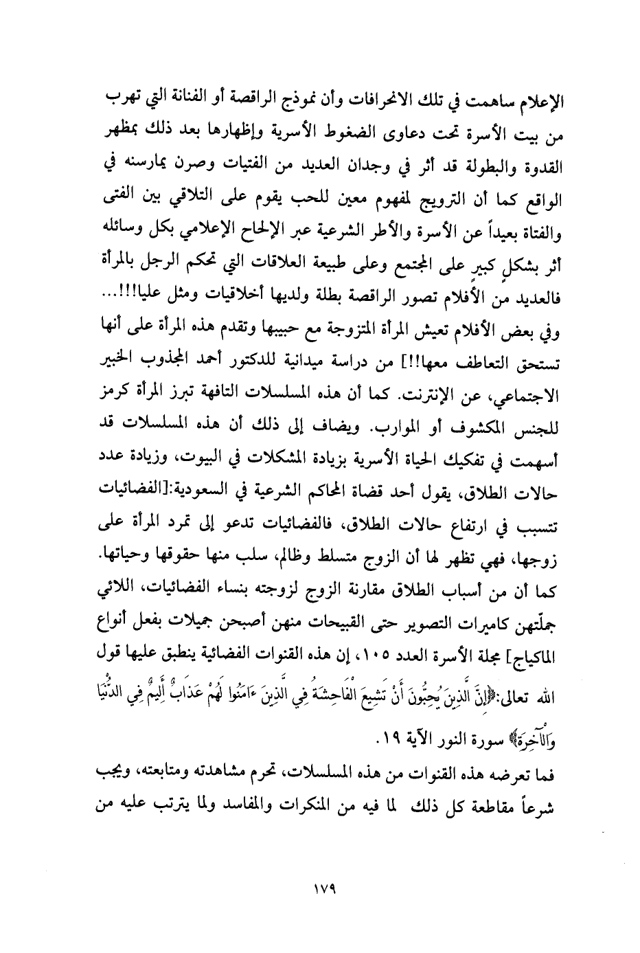 وأن نموذج الراقصة أو الفنانة التي تهرب من بيت الأسرة تحت دعاوى الضغوط الأسرية وإظهارها بعد ذلك بمظهر القدوة والبطولة قد أثر في وجدان العديد من الفتيات وصرن يمارسنه في الواقع كما أن الترويج لمفهوم معين للحب يقوم على التلاقي بين الفتى والفتاة بعيداً عن الأسرة والأطر الشرعية عبر الإلحاح الإعلامي بكل وسائله أثر بشكلٍ كبيرٍ على المجتمع وعلى طبيعة العلاقات التي تحكم الرجل بالمرأة فالعديد من الأفلام تصور الراقصة بطلة ولديها أخلاقيات ومثل عليا!!! ... وفي بعض الأفلام تعيش المرأة المتزوجة مع حبيبها وتقدم هذه المرأة على أنها تستحق التعاطف معها!!] من دراسة ميدانية للدكتور أحمد المجذوب الخبير الاجتماعي، عن الإنترنت. كما أن هذه المسلسلات التافهة تبرز المرأة كرمز للجنس المكشوف أو الموارب. ويضاف إلى ذلك أن هذه المسلسلات قد أسهمت في تفكيك الحياة الأسرية بزيادة المشكلات في البيوت، وزيادة عدد حالات الطلاق، يقول أحد قضاة المحاكم الشرعية في السعودية: [الفضائيات تتسبب في ارتفاع حالات الطلاق، فالفضائيات تدعو إلى تمرد المرأة على زوجها، فهي تظهر لها أن الزوج متسلط وظالم، سلب منها حقوقها وحياتها. كما أن من أسباب الطلاق مقارنة الزوج لزوجته بنساء الفضائيات، اللائي جملّتهن كاميرات التصوير حتى القبيحات منهن أصبحن جميلات بفعل أنواع الماكياج] مجلة الأسرة العدد 105، إن هذه القنوات الفضائية ينطبق عليها قول الله تعالى: {إِنَّ الَّذِينَ يُحِبُّونَ أَنْ تَشِيعَ الْفَاحِشَةُ فِي الَّذِينَءَامَنُوا لَهُمْ عَذَابٌ أَلِيمٌ فِي الدُّنْيَا وَالْآخِرَةِ} سورة النور الآية 19.