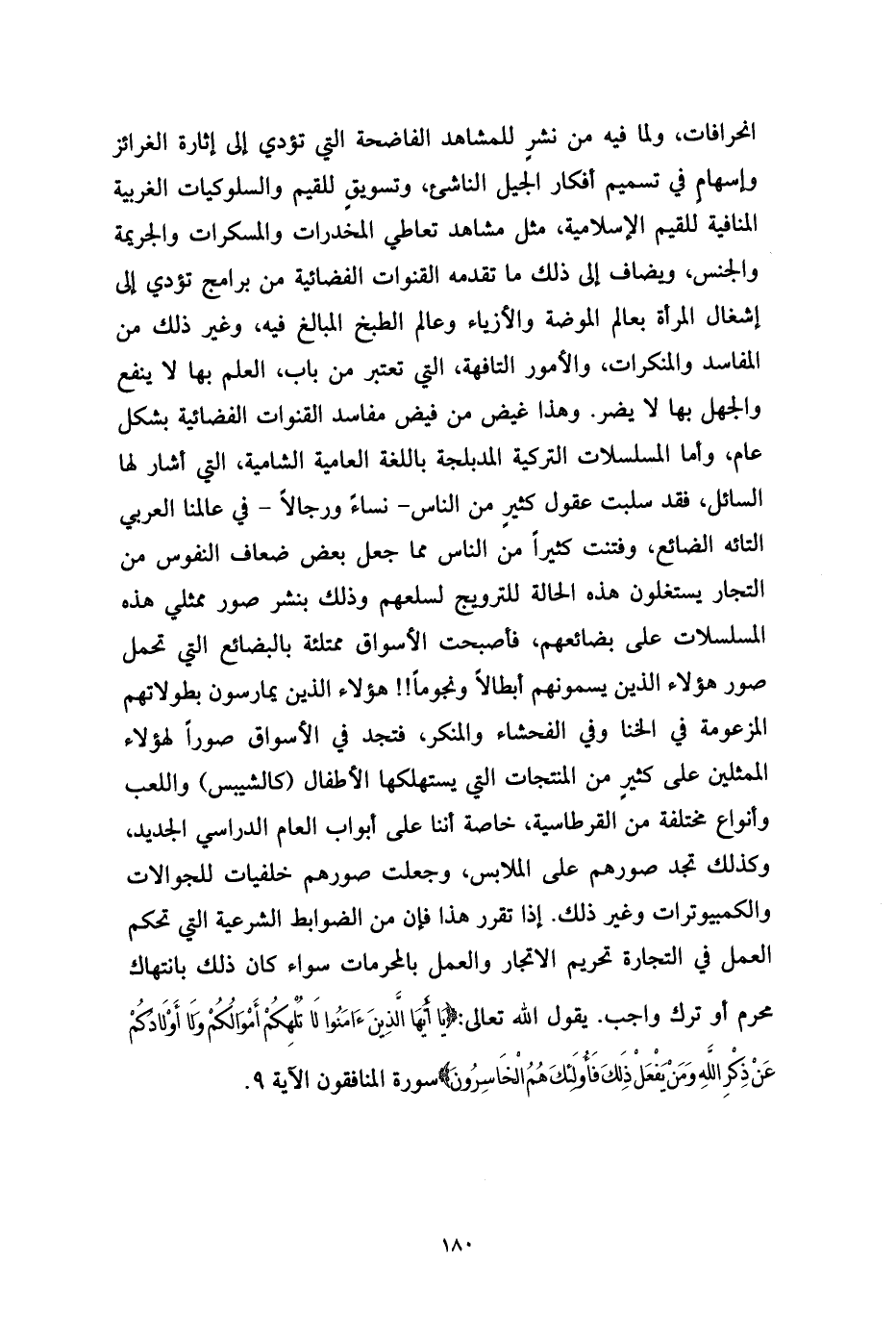 انحرافات، ولما فيه من نشرٍ للمشاهد الفاضحة التي تؤدي إلى إثارة الغرائز وإسهامٍ في تسميم أفكار الجيل الناشئ، وتسويقٍ للقيم والسلوكيات الغربية المنافية للقيم الإسلامية، مثل مشاهد تعاطي المخدرات والمسكرات والجريمة والجنس، ويضاف إلى ذلك ما تقدمه القنوات الفضائية من برامج تؤدي إلى إشغال المرأة بعالم الموضة والأزياء وعالم الطبخ المبالغ فيه، وغير ذلك من المفاسد والمنكرات، والأمور التافهة، التي تعتبر من باب، العلم بها لا ينفع والجهل بها لا يضر. وهذا غيض