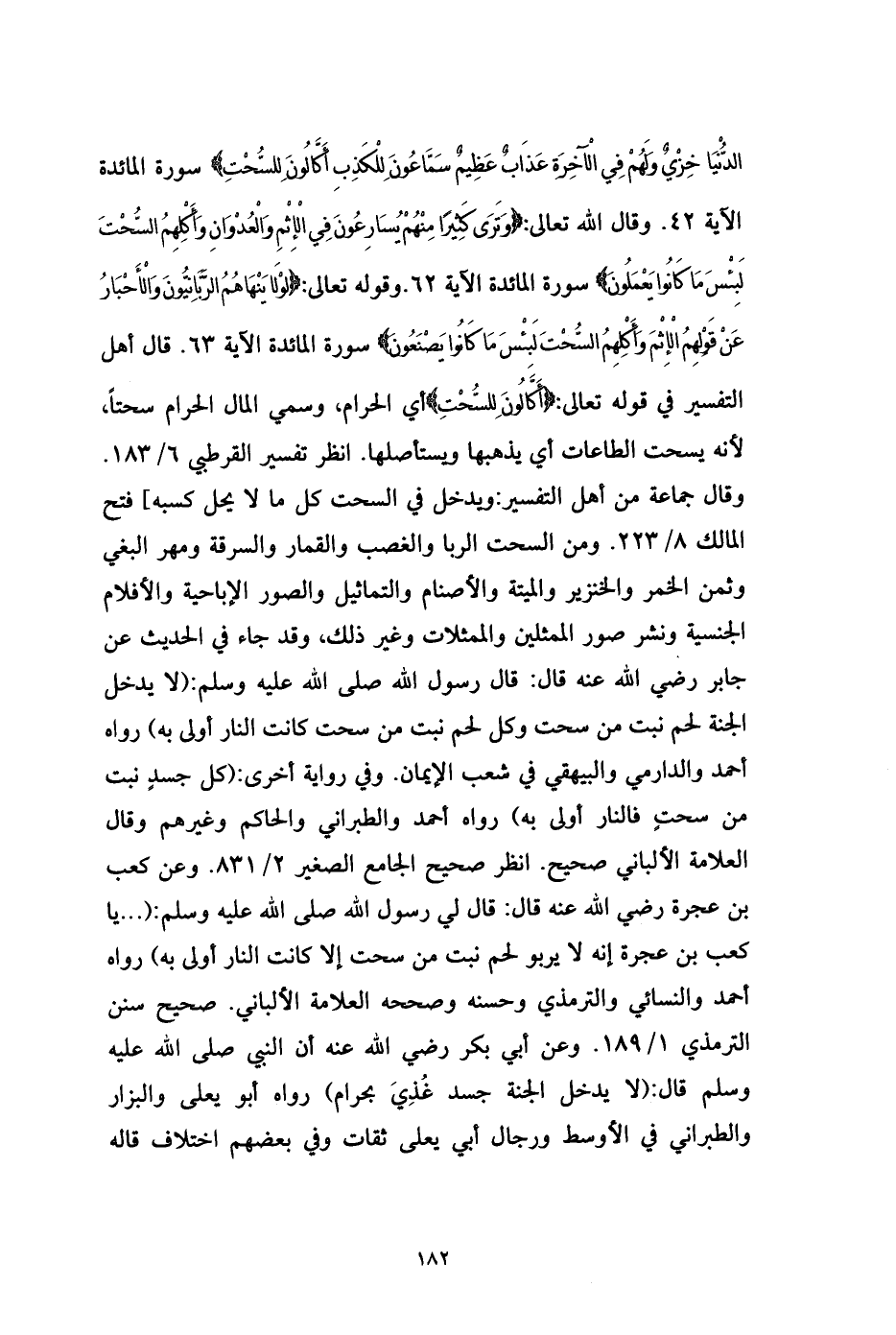 الدُّنْيَا خِزْيٌ وَلَهُمْ فِي الْآخِرَةِ عَذَابٌ عَظِيمٌ سَمَّاعُونَ لِلْكَذِبِ أَكَّالُونَ لِلسُّحْتِ} سورة المائدة الآية 42. وقال الله تعالى: {وَتَرَى كَثِيرًا مِنْهُمْ يُسَارِعُونَ فِي الْإِثْمِ وَالْعُدْوَانِ وَأَكْلِهِمُ السُّحْتَ لَبِئْسَ مَا كَانُوا يَعْمَلُونَ} سورة المائدة الآية 62.وقوله تعالى: {لوْلَا يَنْهَاهُمُ الرَّبَّانِيُّونَ وَالْأَحْبَارُ عَنْ قَوْلِهِمُ الْإِثْمَ وَأَكْلِهِمُ السُّحْتَ لَبِئْسَ مَا كَانُوا يَصْنَعُونَ} سورة المائدة الآية 63. قال أهل التفسير في قوله تعالى: {أَكَّالُونَ لِلسُّحْتِ} أي الحرام، وسمي المال الحرام سحتاً، لأنه يسحت الطاعات أي يذهبها ويستأصلها. انظر تفسير القرطبي 6/ 183. وقال جماعة من أهل التفسير: ويدخل في السحت كل ما لا يحل كسبه] فتح المالك 8/ 223. ومن السحت الربا والغصب والقمار والسرقة ومهر البغي وثمن الخمر والخنزير والميتة والأصنام والتماثيل والصور الإباحية والأفلام الجنسية ونشر صور الممثلين والممثلات وغير ذلك، وقد جاء في الحديث عن جابر رضي الله عنه قال: قال رسول الله صلى الله عليه وسلم: (لا يدخل الجنة لحم نبت من سحت وكل لحم نبت من سحت كانت النار أولى به) رواه أحمد والدارمي والبيهقي في شعب الإيمان. وفي