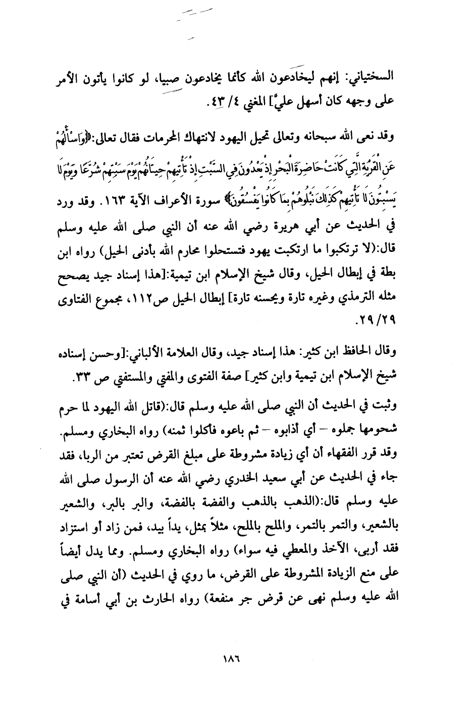 الله عليه وسلم قال: (لا ترتكبوا ما ارتكبت يهود فتستحلوا محارم الله بأدنى الحيل) رواه ابن بطة في إبطال الحيل، وقال شيخ الإسلام ابن تيمية: [هذا إسناد جيد يصحح مثله الترمذي وغيره تارة ويحسنه تارة] إبطال الحيل ص112، مجموع الفتاوى 29/ 29.