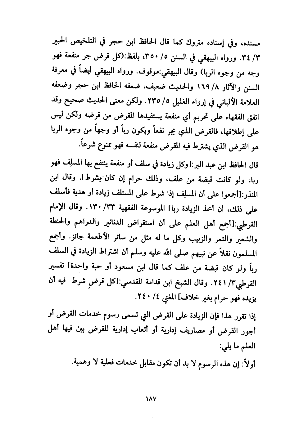 قال الحافظ ابن عبد البر: [وكل زيادة في سلف أو منفعة ينتفع بها المسلِف فهو ربا، ولو كانت قبضة من علف، وذلك حرام إن كان بشرط]. وقال ابن المنذر: [أجمعوا على أن المسلِف إذا شرط على المستلف زيادة أو هدية فأسلف على ذلك، أن أخذ الزيادة ربا] الموسوعة الفقهية 33/ 130. وقال الإمام القرطبي: [أجمع أهل العلم على أن استقراض الدنانير والدراهم والحنطة والشعير والتمر والزبيب وكل ما له مثل من سائر الأطعمة