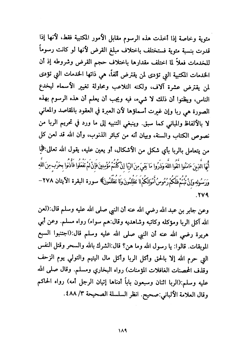 وعن جابر بن عبد الله رضي الله عنه أن النبي صلى الله عليه وسلم قال: (لعن الله آكل الربا ومؤكله وكاتبه وشاهديه وقال: هم سواء) رواه مسلم. وعن أبي هريرة رضي الله عنه أن النبي صلى الله عليه وسلم قال: (اجتنبوا السبع الموبقات. قالوا: يا رسول الله وما هن؟ قال: الشرك بالله والسحر وقتل النفس التي حرم الله إلا بالحق وأكل الربا وأكل مال اليتيم والتولي يوم الزحف وقذف المحصنات الغافلات المؤمنات) رواه البخاري ومسلم. وقال صلى الله عليه وسلم: (الربا اثنان وسبعون باباً أدناها إتيان الرجل أمه) رواه الحاكم وقال العلامة الألباني: صحيح. انظر السلسلة الصحيحة 3/ 488.