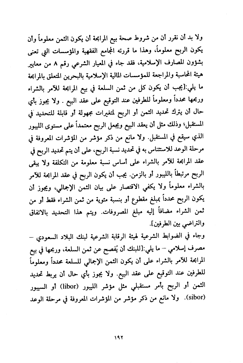 ولا بد أن نقرر أن من شروط صحة بيع المرابحة أن يكون الثمن معلوماً وأن يكون الربح معلوماً، وهذا ما قررته المجامع الفقهية والمؤسسات التي تعنى بشؤون المصارف الإسلامية، فقد جاء في المعيار الشرعي رقم 8 من معايير هيئة المحاسبة والمراجعة للمؤسسات المالية الإسلامية بالبحرين المتعلق بالمرابحة ما يلي: [يجب أن يكون كل من ثمن السلعة في بيع المرابحة للآمر بالشراء وربحها محدداً ومعلوماً للطرفين عند التوقيع على عقد البيع. ولا يجوز بأي حال أن يترك تحديد الثمن أو الربح لمتغيرات مجهولة أو قابلة للتحديد في المستقبل؛ وذلك مثل أن يعقد البيع ويجعل الربح معتمداً على مستوى الليبور الذي سيقع في المستقبل. ولا مانع من ذكر مؤشر من المؤشرات المعروفة في مرحلة الوعد