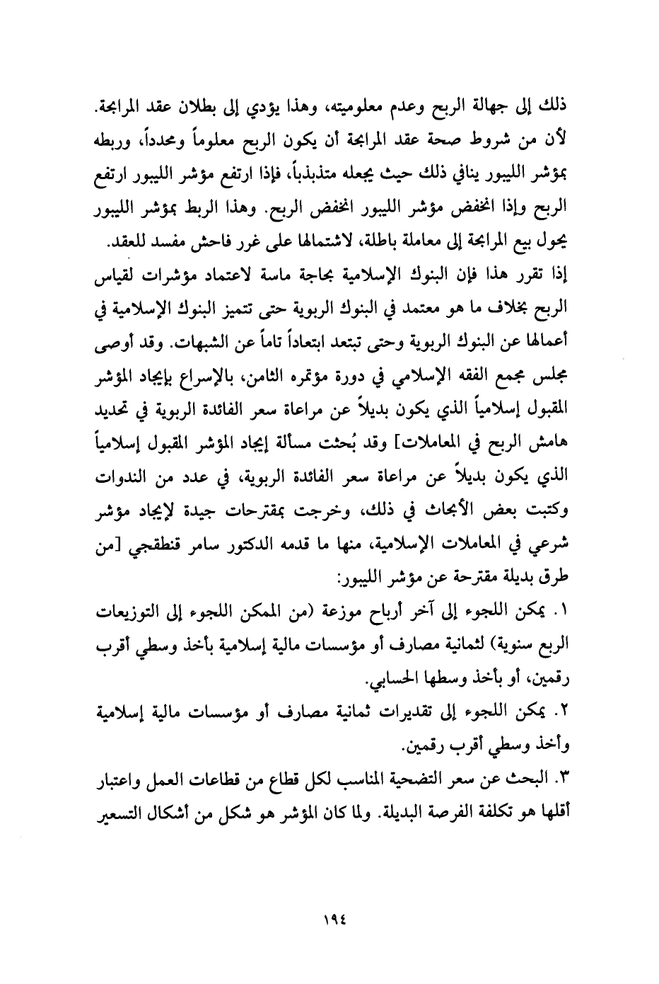 إذا تقرر هذا فإن البنوك الإسلامية بحاجة ماسة لاعتماد مؤشرات لقياس الربح بخلاف ما هو معتمد في البنوك الربوية حتى تتميز البنوك الإسلامية في أعمالها عن البنوك الربوية وحتى تبتعد ابتعاداً تاماً عن الشبهات. وقد أوصى مجلس مجمع الفقه الإسلامي في دورة مؤتمره الثامن، بالإسراع بإيجاد المؤشر المقبول إسلامياً الذي يكون بديلاً عن مراعاة سعر الفائدة الربوية في تحديد هامش الربح في المعاملات] وقد بُحثت مسألة إيجاد المؤشر المقبول إسلامياً الذي يكون بديلاً عن مراعاة سعر الفائدة الربوية، في عدد من الندوات وكتبت بعض الأبحاث في ذلك، وخرجت بمقترحات جيدة لإيجاد مؤشر شرعي في المعاملات الإسلامية، منها ما قدمه الدكتور سامر قنطقجي [من طرق بديلة مقترحة عن مؤشر الليبور: