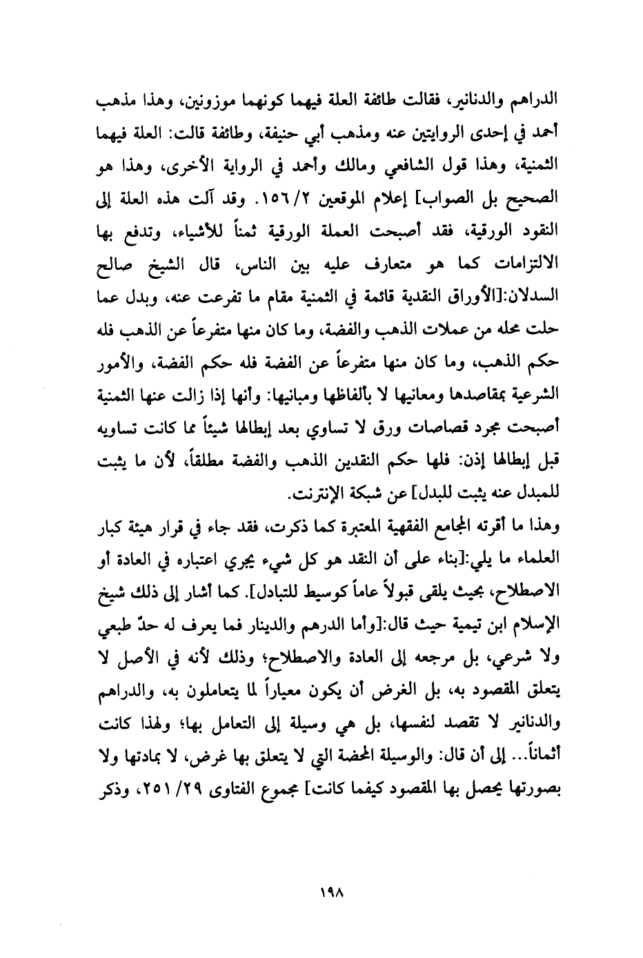 الدراهم والدنانير، فقالت طائفة العلة فيهما كونهما موزونين، وهذا مذهب أحمد في إحدى الروايتين عنه ومذهب أبي حنيفة، وطائفة قالت: العلة فيهما الثمنية، وهذا قول الشافعي ومالك وأحمد في الرواية الأخرى، وهذا هو الصحيح بل الصواب] إعلام الموقعين 2/ 156. وقد آلت هذه العلة إلى النقود الورقية، فقد أصبحت العملة الورقية ثمناً للأشياء، وتدفع بها الالتزامات كما هو متعارف عليه بين الناس، قال الشيخ صالح السدلان: [الأوراق النقدية قائمة في الثمنية