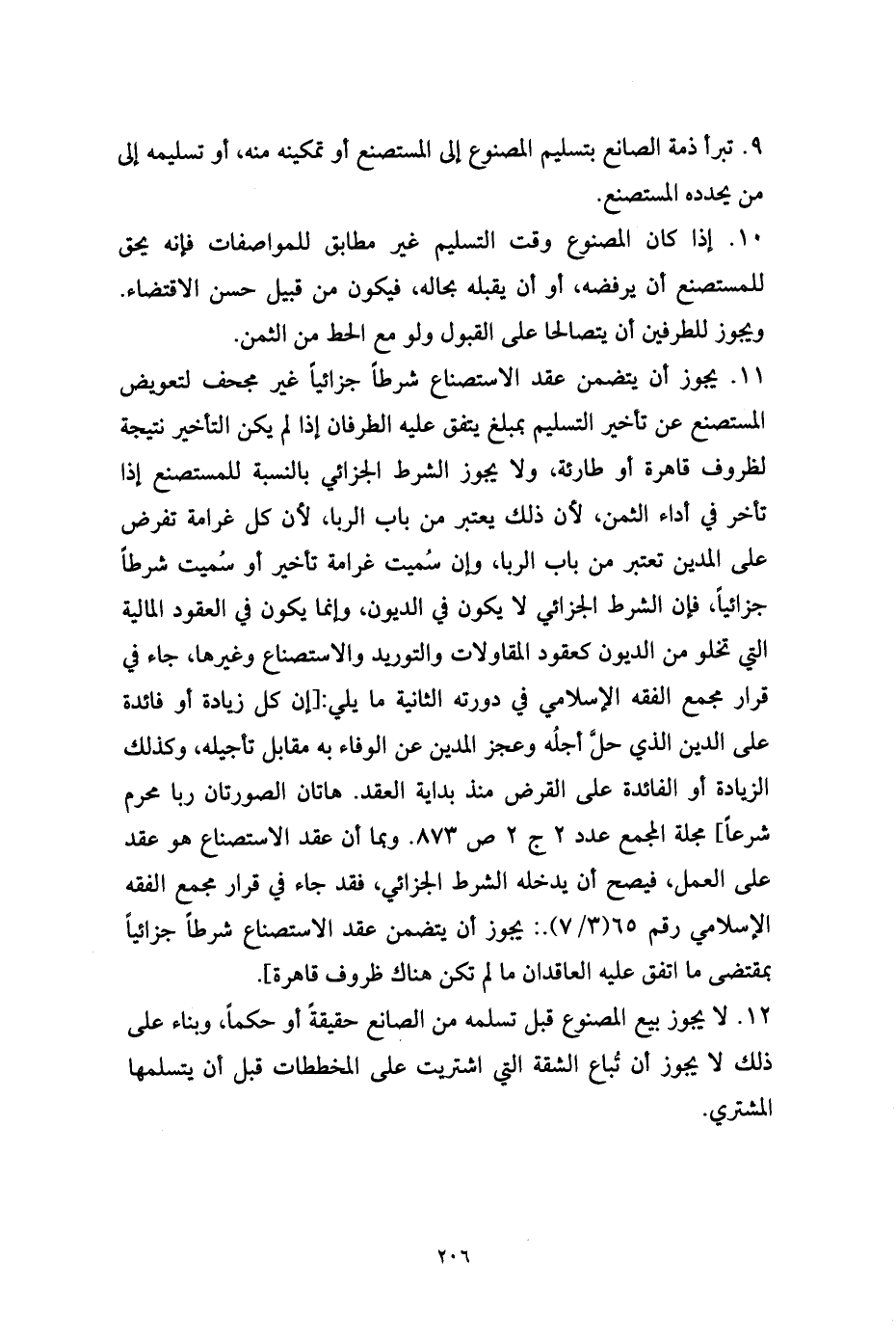 11. يجوز أن يتضمن عقد الاستصناع شرطاً جزائياً غير مجحف لتعويض المستصنع عن تأخير التسليم بمبلغ يتفق عليه الطرفان إذا لم يكن التأخير نتيجة لظروف قاهرة أو طارئة، ولا يجوز الشرط الجزائي بالنسبة للمستصنع إذا تأخر في أداء الثمن، لأن ذلك يعتبر من باب الربا، لأن كل غرامة تفرض على المدين تعتبر من باب الربا، وإن سُميت غرامة تأخير أو سُميت شرطاً جزائياً، فإن الشرط الجزائي لا يكون في الديون، وإنما يكون في العقود المالية التي تخلو من الديون كعقود المقاولات والتوريد والاستصناع وغيرها، جاء في قرار مجمع الفقه الإسلامي في دورته الثانية ما يلي: [إن كل زيادة أو فائدة على الدين الذي حلَّ أجلُه وعجز المدين عن الوفاء به مقابل تأجيله، وكذلك الزيادة أو الفائدة على القرض منذ بداية العقد. هاتان الصورتان ربا محرم شرعاً] مجلة المجمع عدد 2 ج 2 ص 873. وبما أن عقد الاستصناع هو عقد على العمل، فيصح أن يدخله الشرط الجزائي، فقد جاء في قرار مجمع الفقه الإسلامي رقم 65 (3/ 7).: يجوز أن يتضمن عقد الاستصناع شرطاً جزائياً بمقتضى ما اتفق عليه العاقدان ما لم تكن هناك ظروف قاهرة].