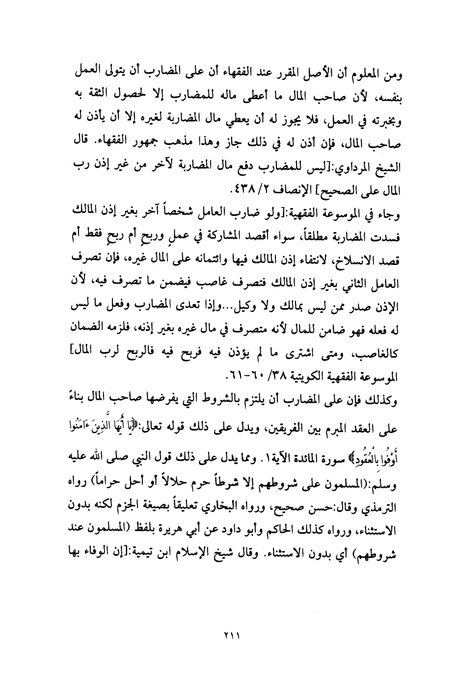وكذلك فإن على المضارب أن يلتزم بالشروط التي يفرضها صاحب المال بناءً على العقد المبرم بين الفريقين، ويدل على ذلك قوله تعالى: {يَا أَيُّهَا الَّذِينَءَامَنُوا أَوْفُوا بِالْعُقُودِ} سورة المائدة الآية1. ومما يدل على ذلك قول النبي صلى الله عليه وسلم: (المسلمون على شروطهم إلا شرطاً حرم حلالاً أو أحل حراماً) رواه الترمذي وقال: حسن صحيح، ورواه البخاري تعليقاً بصيغة الجزم لكنه بدون الاستثناء، ورواه كذلك الحاكم وأبو داود عن أبي هريرة بلفظ (المسلمون عند شروطهم) أي بدون الاستثناء. وقال شيخ الإسلام ابن تيمية: [إن الوفاء بها