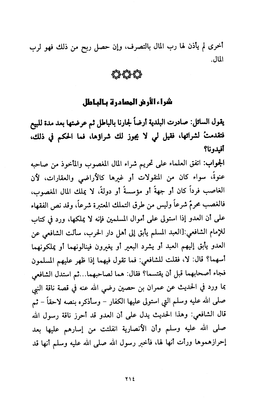 الجواب: اتفق العلماء على تحريم شراء المال المغصوب والمأخوذ من صاحبه عنوةً، سواء كان من المنقولات أو غيرها كالأراضي والعقارات، لأن الغاصب فرداً كان أو جهةً أو مؤسسةً أو دولةً، لا يملك المال المغصوب، فالغصب محرمٌ شرعاً وليس من طرق التملك المعتبرة شرعاً، وقد نص الفقهاء على أن العدو إذا استولى على أموال المسلمين فإنه لا يملكها، ورد في كتاب للإمام الشافعي: [العبد المسلم يأبق إلى أهل دار الحرب، سألت الشافعي عن العدو يأبق إليهم العبد أو يشرد البعير أو يغيرون فينالونهما أو يملكونهما أسهما؟ قال: لا، فقلت للشافعي: فما تقول فيهما إذا ظهر عليهم المسلمون فجاء أصحابهما قبل أن يقتسما؟ فقال: هما لصاحبهما ... ثم استدل الشافعي بما ورد في الحديث عن عمران بن حصين رضي الله عنه في قصة ناقة النبي صلى الله عليه وسلم التي استولى عليها الكفار - وسأذكره بنصه لاحقاً - ثم قال الشافعي: وهذا الحديث يدل على أن العدو قد أحرز ناقة رسول الله صلى الله عليه وسلم وأن الأنصارية انفلتت من إسارهم عليها بعد إحرازهموها ورأت أنها لها، فأخبر رسول الله صلى الله عليه وسلم أنها قد