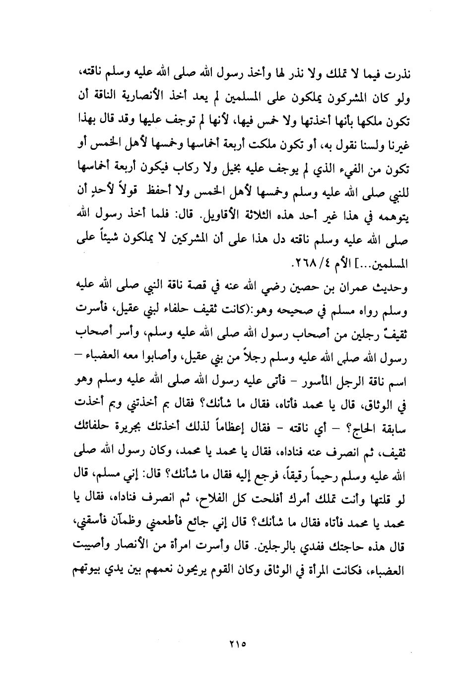 الذي لم يوجف عليه بخيل ولا ركاب فيكون أربعة أخماسها للنبي صلى الله عليه وسلم وخمسها لأهل الخمس ولا أحفظ قولاً لأحدٍ أن يتوهمه في هذا غير أحد هذه الثلاثة الأقاويل. قال: فلما أخذ رسول الله صلى الله عليه وسلم ناقته دل هذا على أن المشركين لا يملكون شيئاً على المسلمين ... ] الأم 4/ 268.