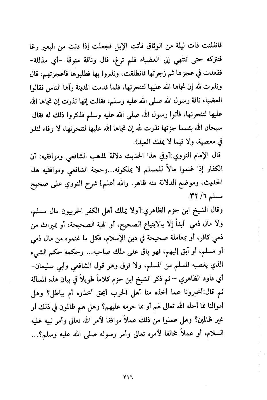 وقال الشيخ ابن حزم الظاهري: [ولا يملك أهل الكفر الحربيون مال مسلم، ولا مال ذمي أبداً إلا بالابتياع الصحيح، أو الهبة الصحيحة، أو بميراث من ذمي كافر، أو بمعاملة صحيحة في دين الإسلام، فكل ما غنموه من مال ذمي أو مسلم، أو آبق إليهم، فهو باق على ملك صاحبه ... وحكمه حكم الشيء الذي يغصبه المسلم من المسلم، ولا فرق. وهو قول الشافعي وأبي سليمان- أي داود الظاهري - ثم ذكر الشيخ ابن حزم كلاماً طويلاً في بيان هذه المسألة ثم قال: أخبرونا عما أخذه منا أهل الحرب أبحق أخذوه أم بباطل؟ وهل أموالنا مما أحله الله تعالى لهم أو مما حرمه عليهم؟ وهل هم ظالمون في ذلك أو غير ظالمين؟ وهل عملوا من ذلك عملاً موافقا لأمر الله تعالى وأمر نبيه عليه السلام، أو عملاً مخالفا لأمره تعالى وأمر رسوله صلى الله عليه وسلم؟