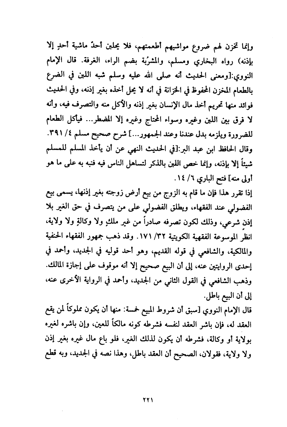 وقال الحافظ ابن عبد البر: [في الحديث النهي عن أن يأخذ المسلم للمسلم شيئاً إلا بإذنه، وإنما خص اللبن بالذكر لتساهل الناس فيه فنبه به على ما هو أولى منه] فتح الباري 6/ 14.