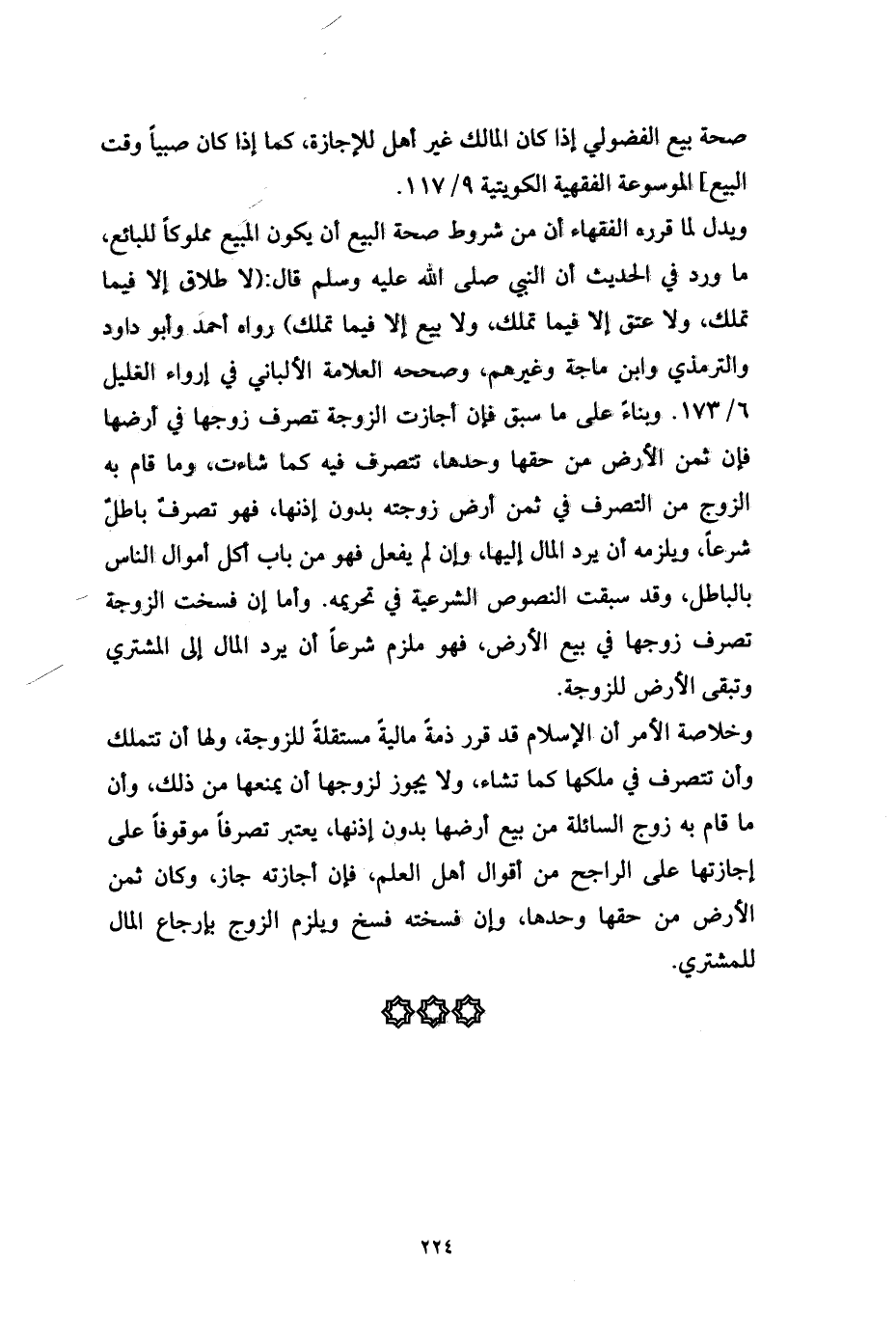 تحريمه. وأما إن فسخت الزوجة تصرف زوجها في بيع الأرض، فهو ملزم شرعاً أن يرد المال إلى المشتري وتبقى الأرض للزوجة.