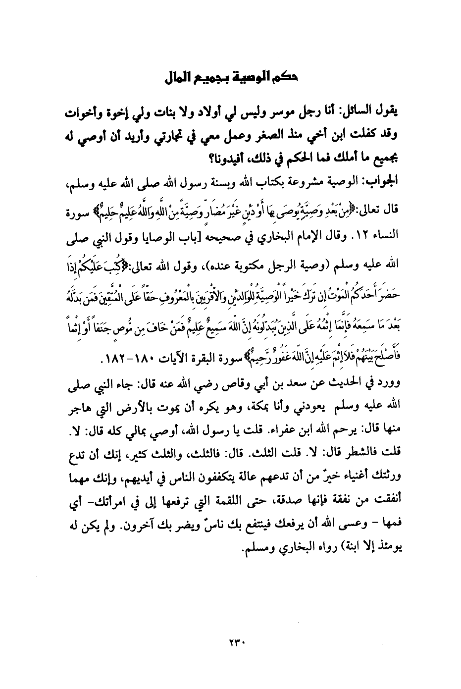 الجواب: الوصية مشروعة بكتاب الله وبسنة رسول الله صلى الله عليه وسلم، قال تعالى: {مِنْ بَعْدِ وَصِيَّةٍ يُوصَى بِهَا أَوْ دَيْنٍ غَيْرَ مُضَارٍّ وَصِيَّةً مِنْ اللَّهِ وَاللَّهُ عَلِيمٌ حَلِيمٌ} سورة النساء 12. وقال الإمام البخاري في صحيحه [باب الوصايا وقول النبي صلى الله عليه وسلم (وصية الرجل مكتوبة عنده)، وقول الله تعالى: {كُتِبَ عَلَيْكُمْ إِذَا حَضَرَ أَحَدَكُمُ الْمَوْتُ إِن تَرَكَ خَيْراً الْوَصِيَّةُ لِلْوَالِدَيْنِ وَالأقْرَبِينَ بِالْمَعْرُوفِ حَقّاً عَلَى الْمُتَّقِينَ فَمَن بَدَّلَهُ بَعْدَ مَا سَمِعَهُ فَإِنَّمَا إِثْمُهُ عَلَى الَّذِينَ يُبَدِّلُونَهُ إِنَّ اللهَ سَمِيعٌ عَلِيمٌ فَمَنْ خَافَ مِن مُّوصٍ جَنَفاً أَوْ إِثْماً فَأَصْلَحَ بَيْنَهُمْ فَلاَ إِثْمَ عَلَيْهِ إِنَّ اللهَ غَفُورٌ رَّحِيمٌ} سورة البقرة الآيات 180 - 182.