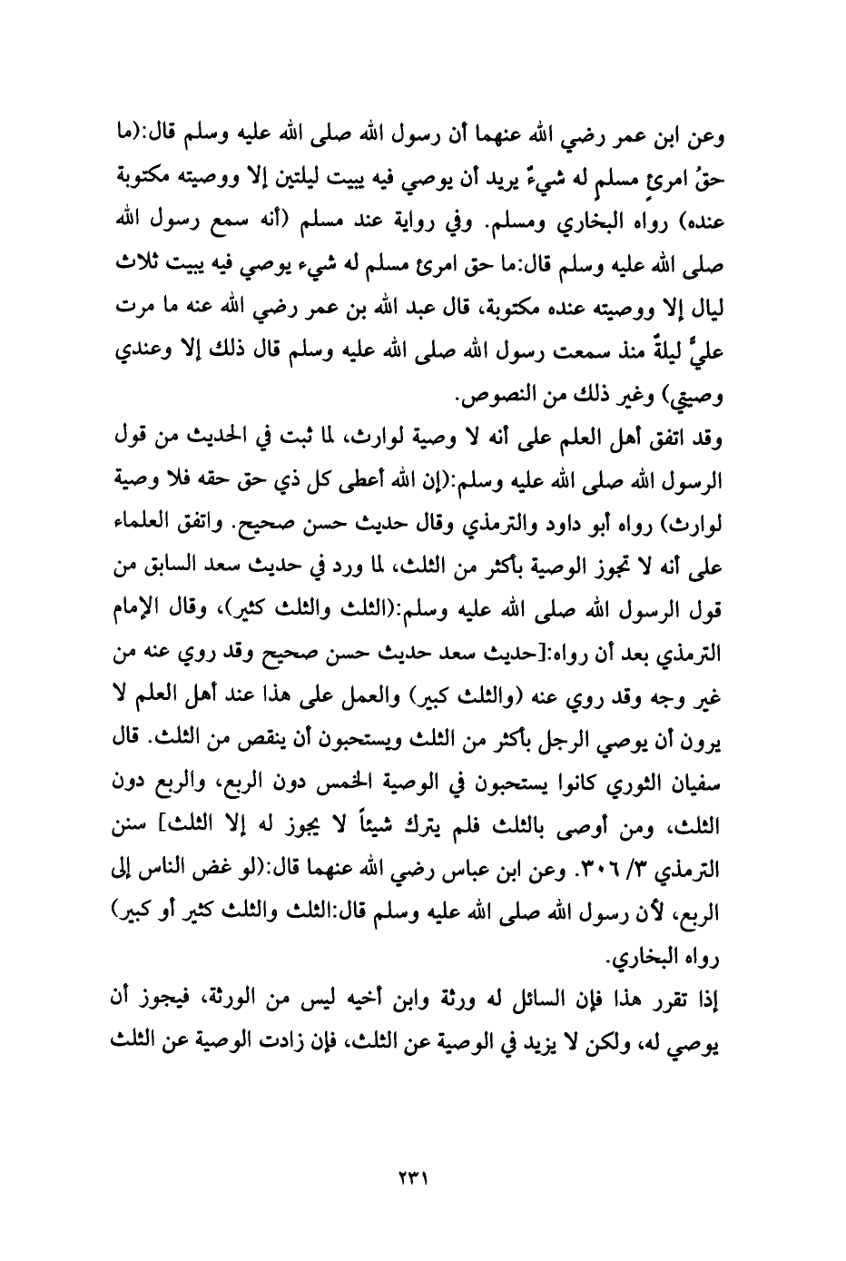 وعن ابن عمر رضي الله عنهما أن رسول الله صلى الله عليه وسلم قال: (ما حقُ امرئٍ مسلمٍ له شيءٌ يريد أن يوصي فيه يبيت ليلتين إلا ووصيته مكتوبة عنده) رواه البخاري ومسلم. وفي رواية عند مسلم (أنه سمع رسول الله صلى الله عليه وسلم قال: ما حق امرئ مسلم له شيء يوصي فيه يبيت ثلاث ليال إلا ووصيته عنده مكتوبة، قال عبد الله بن عمر رضي الله عنه ما مرت عليًّ ليلةٌ منذ سمعت رسول الله صلى الله عليه وسلم قال ذلك إلا وعندي وصيتي) وغير ذلك من النصوص.