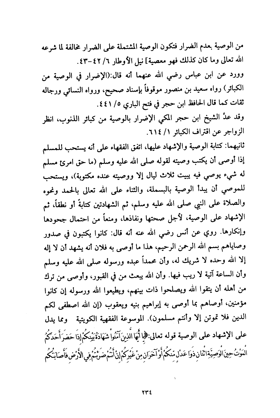 وقد عدَّ الشيخ ابن حجر المكي الإضرار بالوصية من كبائر الذنوب، انظر الزواجر عن اقتراف الكبائر 1/ 614.