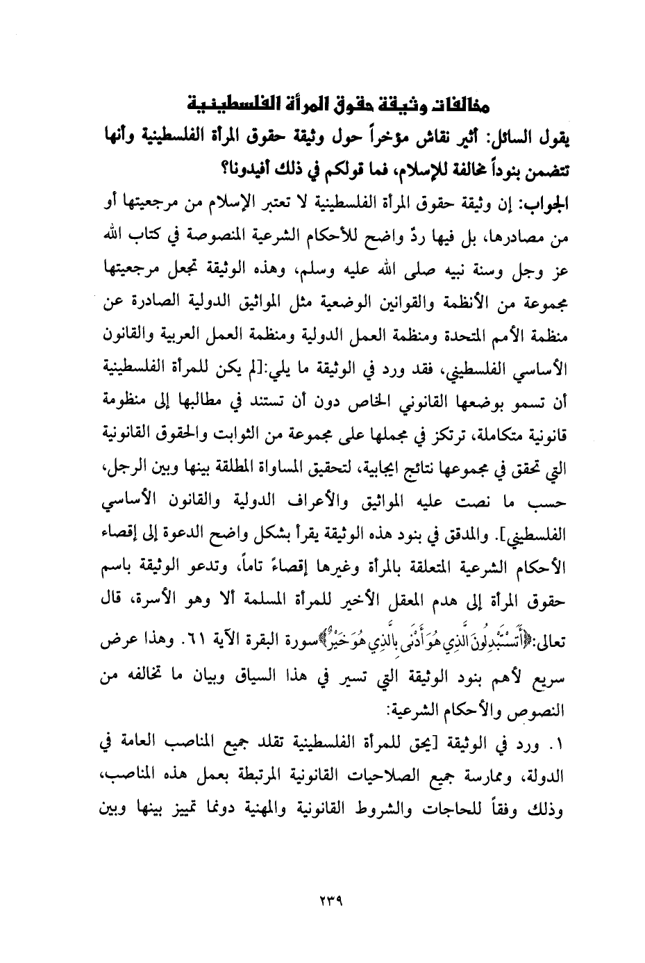 الجواب: إن وثيقة حقوق المرأة الفلسطينية لا تعتبر الإسلام من مرجعيتها أو من مصادرها، بل فيها ردٌ واضح للأحكام الشرعية المنصوصة في كتاب الله عز وجل وسنة نبيه صلى الله عليه وسلم، وهذه الوثيقة تجعل مرجعيتها مجموعة من الأنظمة والقوانين الوضعية مثل المواثيق الدولية الصادرة عن منظمة الأمم المتحدة ومنظمة العمل الدولية ومنظمة العمل العربية والقانون الأساسي الفلسطيني، فقد ورد في الوثيقة ما يلي: [لم يكن للمرأة الفلسطينية أن تسمو بوضعها القانوني الخاص دون أن تستند في مطالبها إلى منظومة قانونية متكاملة، ترتكز في مجملها على مجموعة من الثوابت والحقوق القانونية التي تحقق في مجموعها نتائج ايجابية، لتحقيق المساواة المطلقة بينها وبين الرجل، حسب ما نصت عليه المواثيق والأعراف الدولية والقانون الأساسي الفلسطيني]. والمدقق في بنود هذه الوثيقة يقرأ بشكل واضح الدعوة إلى إقصاء الأحكام الشرعية المتعلقة بالمرأة وغيرها إقصاءً تاماً، وتدعو الوثيقة باسم حقوق المرأة إلى هدم المعقل الأخير للمرأة المسلمة ألا وهو الأسرة، قال تعالى: {أَتَسْتَبْدِلُونَ الَّذِي هُوَ أَدْنَى بِالَّذِي هُوَ خَيْرٌ} سورة البقرة الآية 61. وهذا عرض سريع لأهم بنود الوثيقة التي تسير في هذا السياق وبيان ما تخالفه من النصوص والأحكام الشرعية: