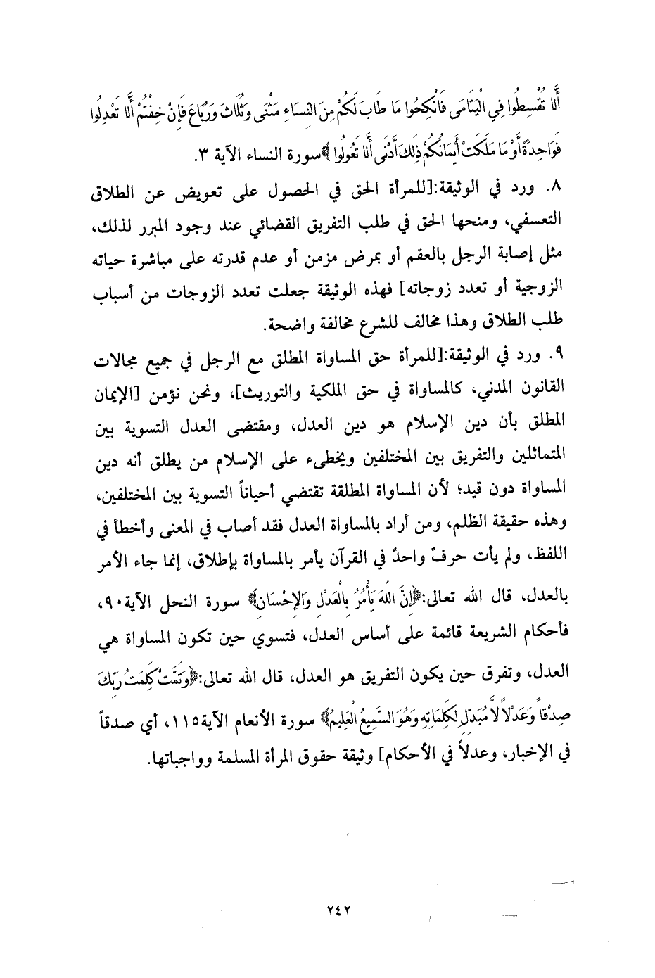 9. ورد في الوثيقة: [للمرأة حق المساواة المطلق مع الرجل في جميع مجالات القانون المدني، كالمساواة في حق الملكية والتوريث]، ونحن نؤمن [الإيمان المطلق بأن دين الإسلام هو دين العدل، ومقتضى العدل التسوية بين المتماثلين والتفريق بين المختلفين ويخطىء على الإسلام من يطلق أنه دين المساواة دون قيد؛ لأن المساواة المطلقة تقتضي أحياناً التسوية بين المختلفين، وهذه حقيقة الظلم، ومن أراد بالمساواة العدل فقد أصاب في المعنى وأخطأ في اللفظ، ولم يأت حرفٌ واحدٌ في القرآن يأمر بالمساواة بإطلاق، إنما جاء الأمر بالعدل، قال الله تعالى: {إِنَّ اللهَ يَأْمُرُ بِالْعَدْلِ