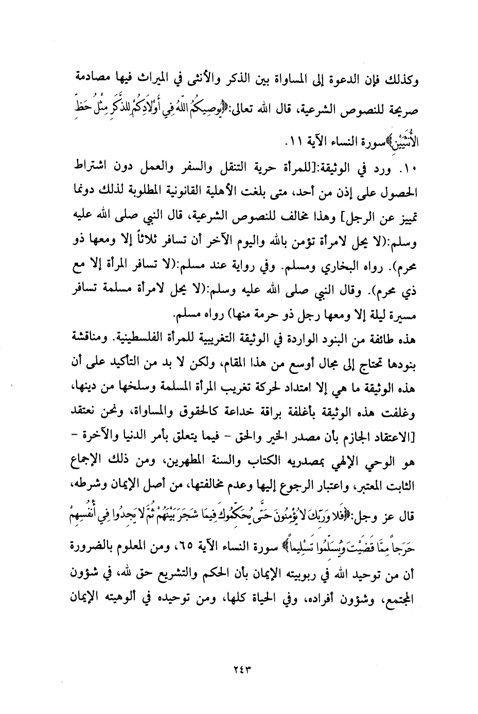 هذه طائفة من البنود الواردة في الوثيقة التغريبية للمرأة الفلسطينية. ومناقشة بنودها تحتاج إلى مجال أوسع من هذا المقام، ولكن لا بد من التأكيد على أن هذه الوثيقة ما هي إلا امتداد لحركة تغريب المرأة المسلمة وسلخها من دينها، وغلفت هذه الوثيقة بأغلفة براقة خداعة كالحقوق والمساواة، ونحن نعتقد [الاعتقاد الجازم بأن مصدر الخير والحق - فيما يتعلق بأمر الدنيا والآخرة - هو الوحي الإلهي بمصدريه الكتاب والسنة المطهرين، ومن ذلك الإجماع الثابت المعتبر، واعتبار الرجوع إليها وعدم مخالفتها، من أصل الإيمان وشرطه، قال عز وجل: {فَلا وَرَبِّكَ لا يُؤْمِنُونَ حَتَّى يُحَكِّمُوكَ فِيمَا شَجَرَ بَيْنَهُمْ ثُمَّ لا يَجِدُوا فِي أَنْفُسِهِمْ حَرَجاً مِمَّا قَضَيْتَ وَيُسَلِّمُوا تَسْلِيماً} سورة النساء الآية 65، ومن المعلوم بالضرورة أن من توحيد الله في ربوبيته