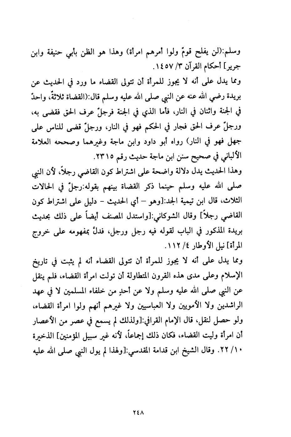 وسلم: (لن يفلح قومٌ ولوا أمرهم امرأة) وهذا هو الظن بأبي حنيفة وابن جرير] أحكام القرآن 3/ 1457.